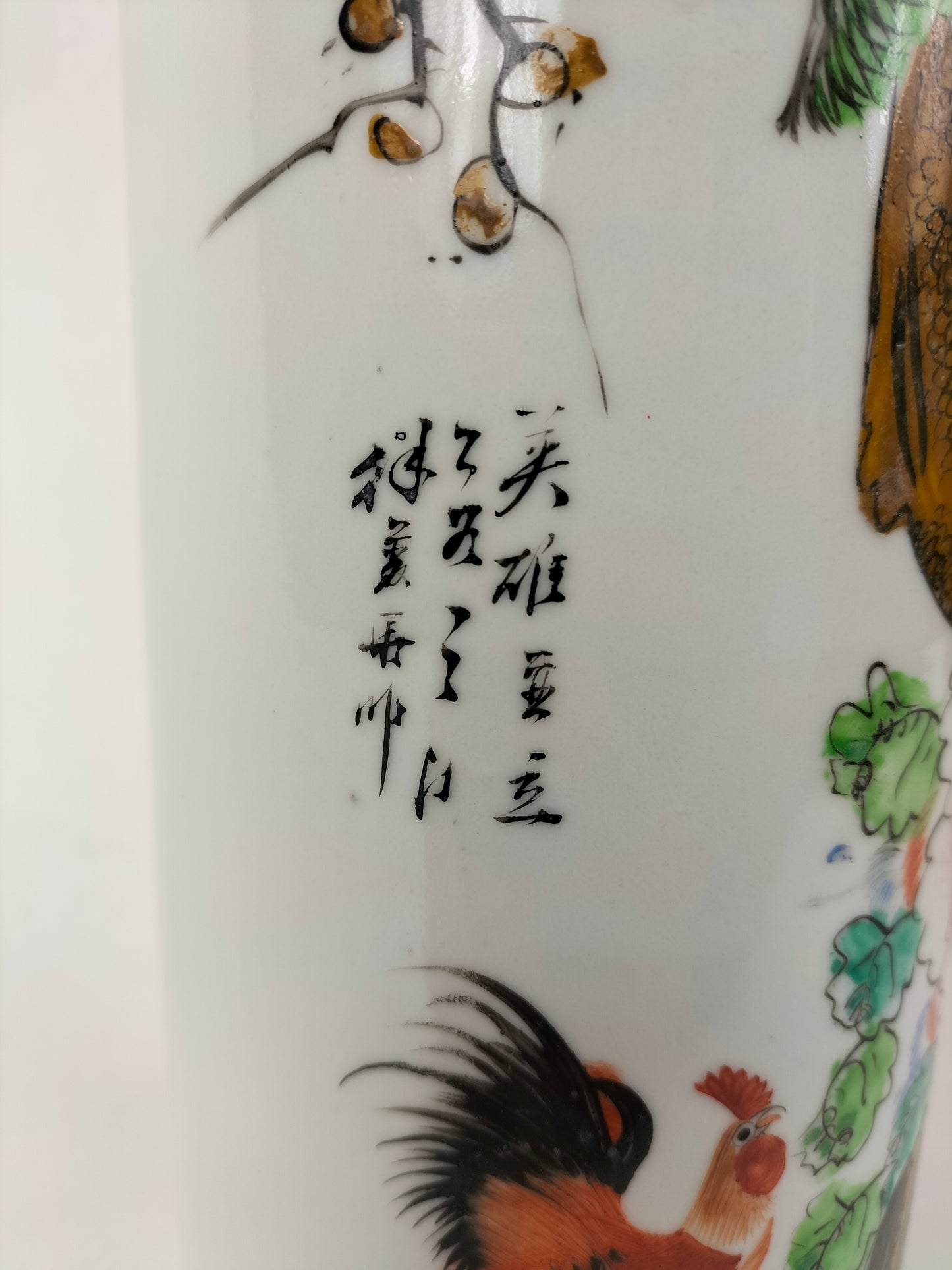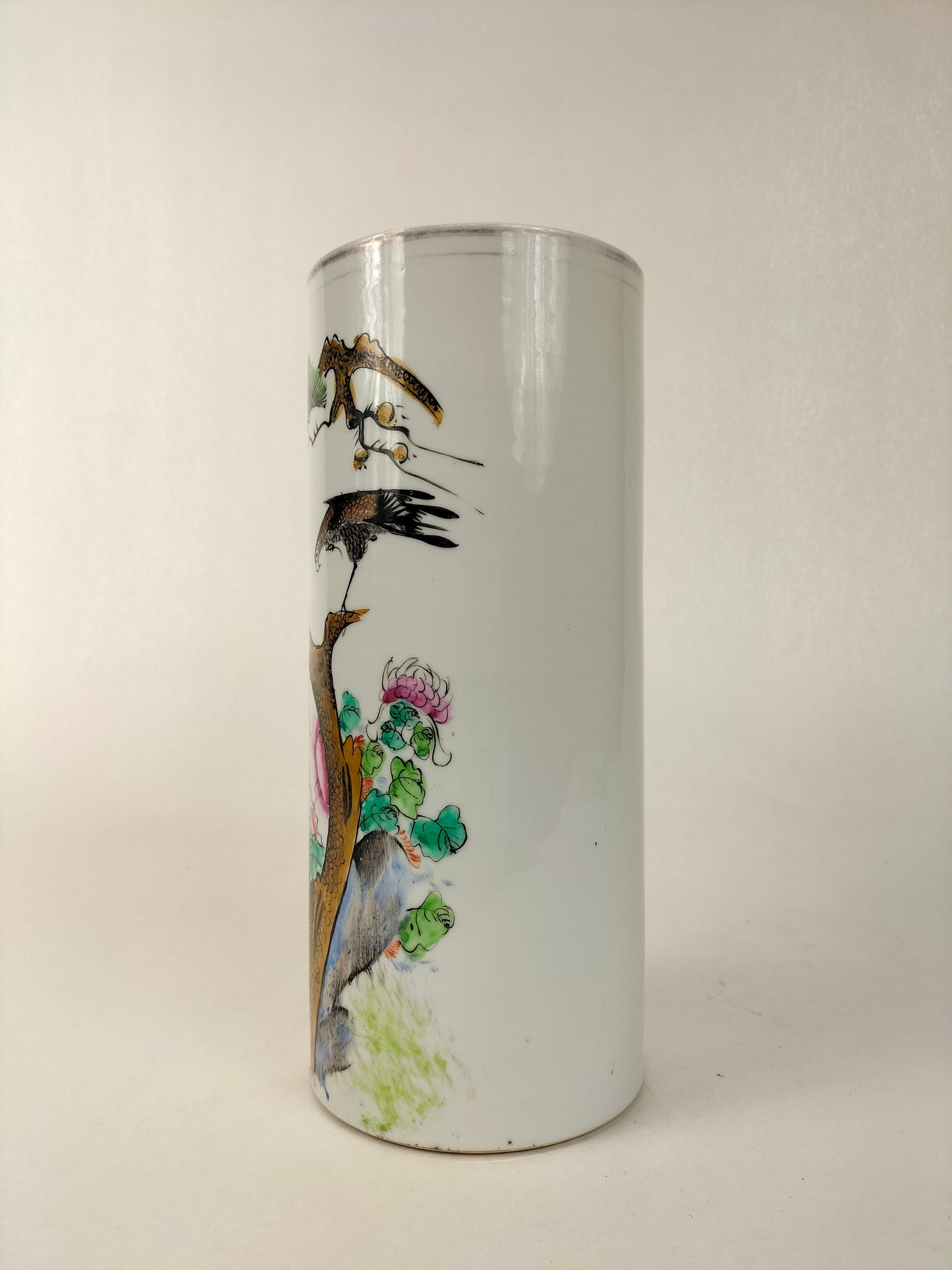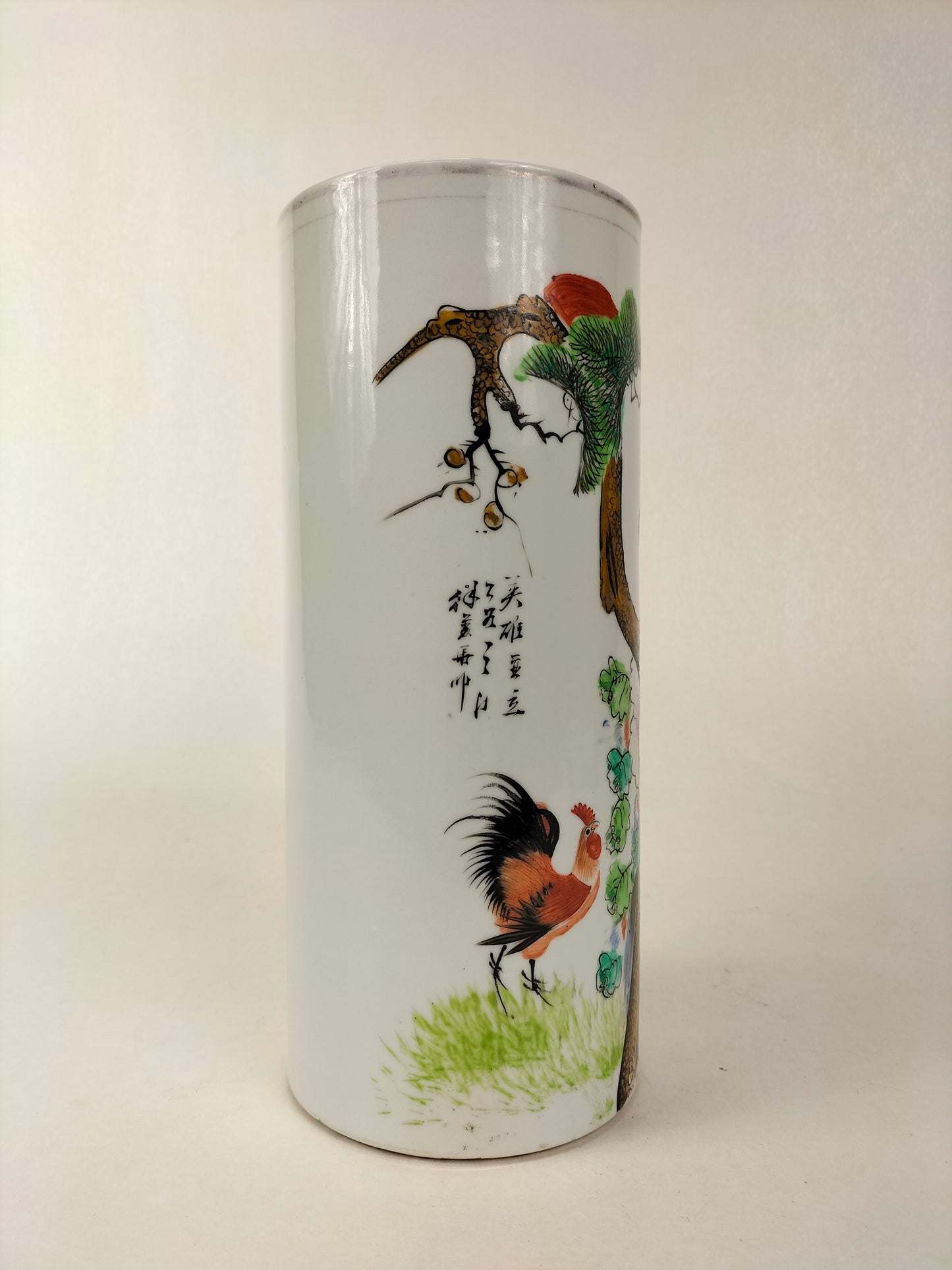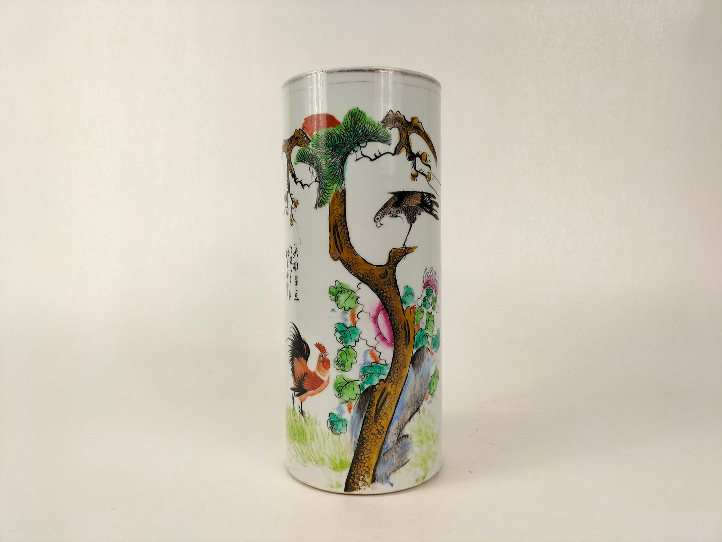 An antique porcelain famille rose hatstand/scroll holder decorated with a rooster and an eagle in a nature scene. The vase is made in China and dates from the Republic period (1912-1949).