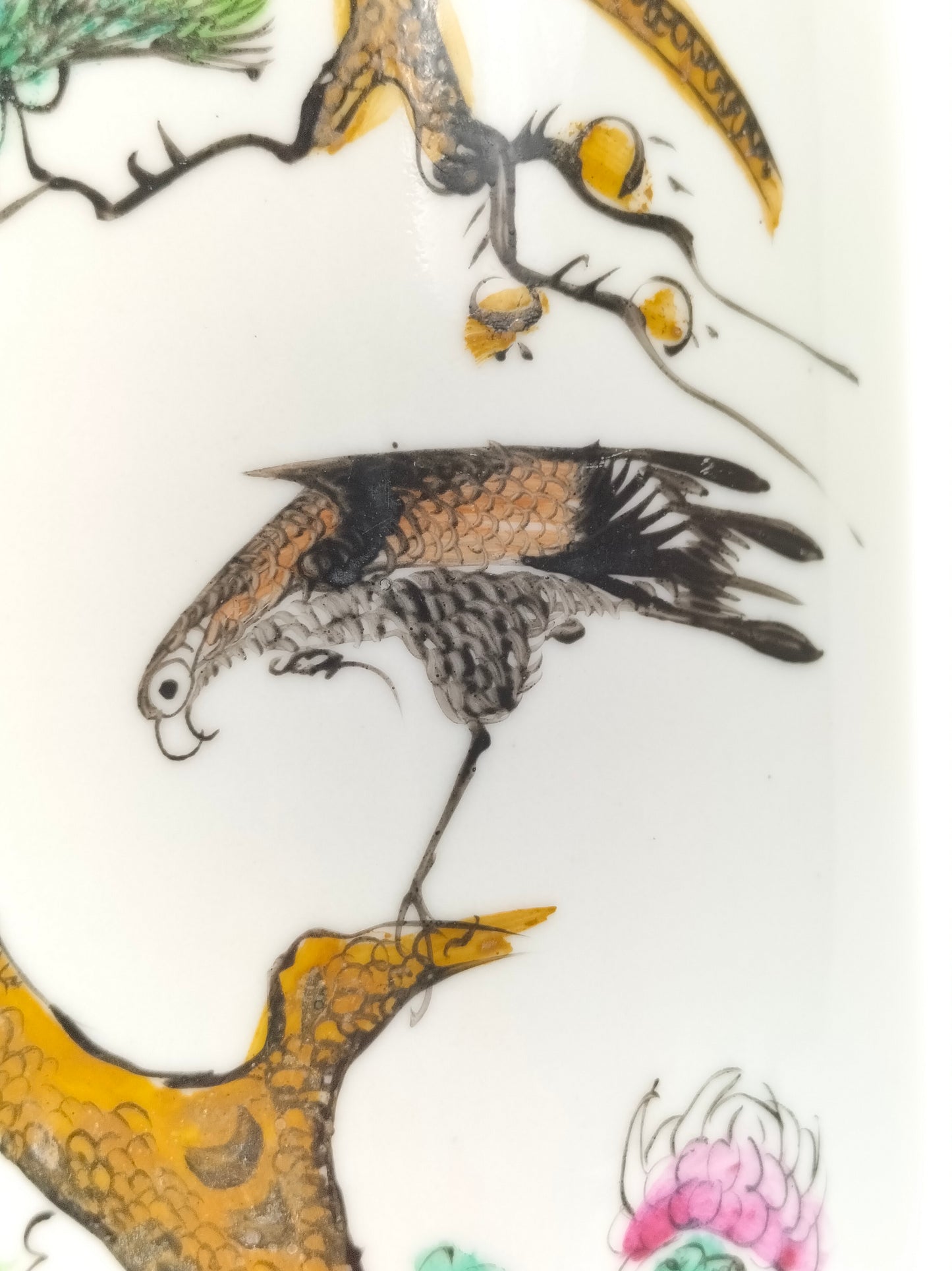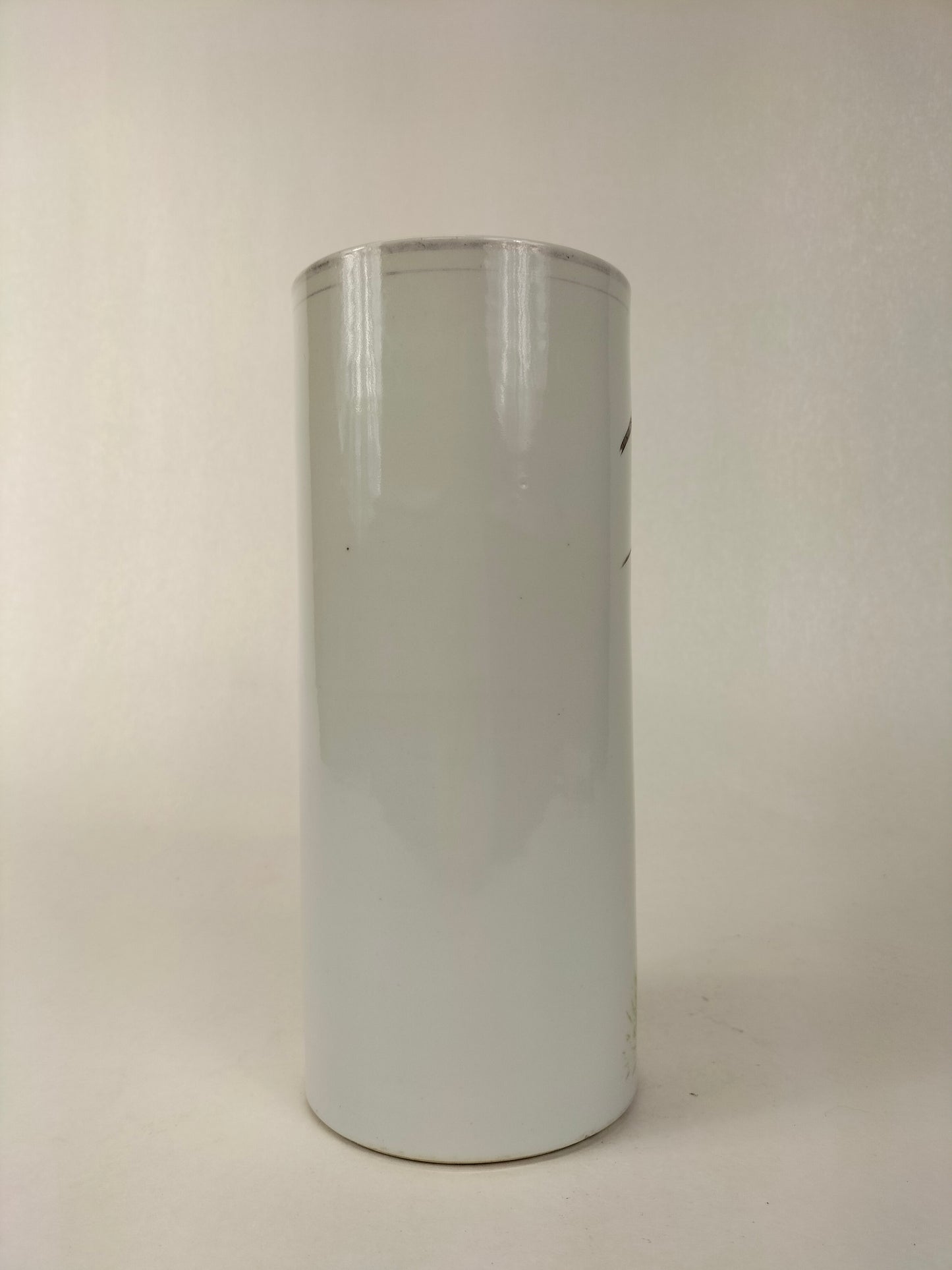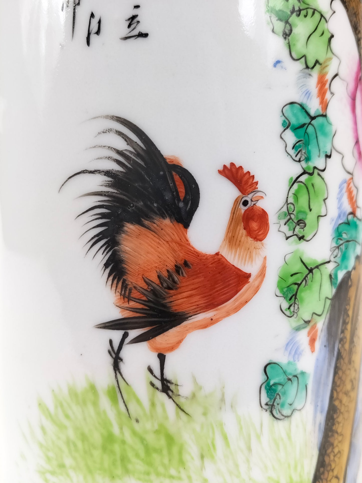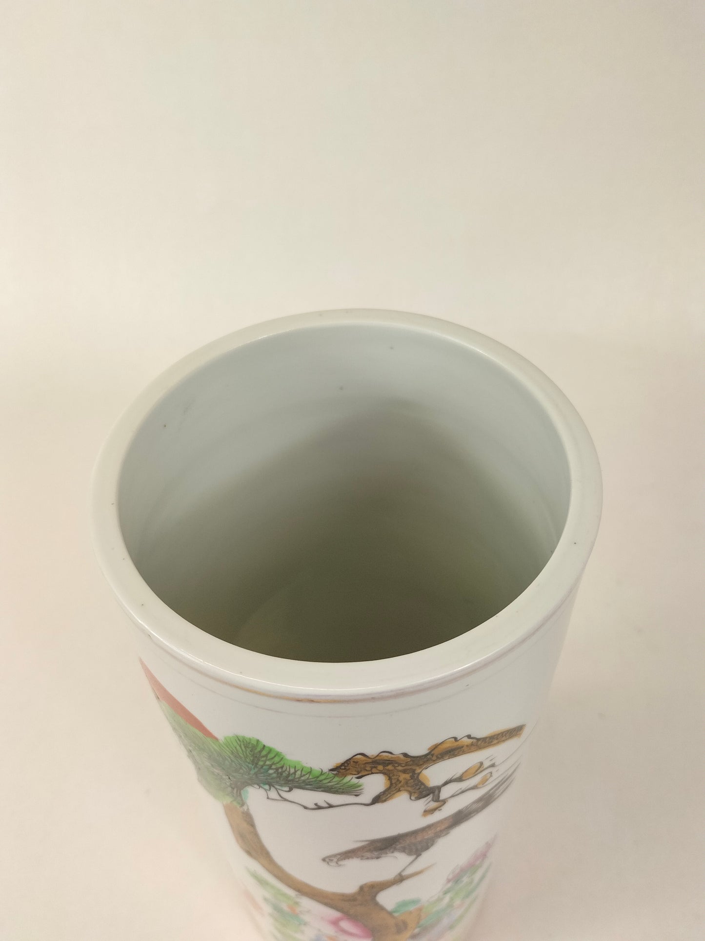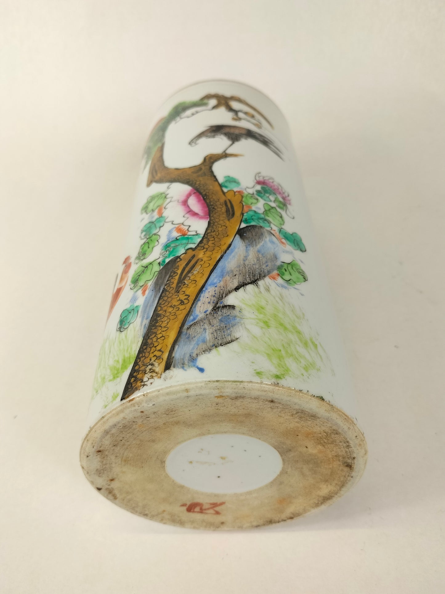 An antique porcelain famille rose hatstand/scroll holder decorated with a rooster and an eagle in a nature scene. The vase is made in China and dates from the Republic period (1912-1949).