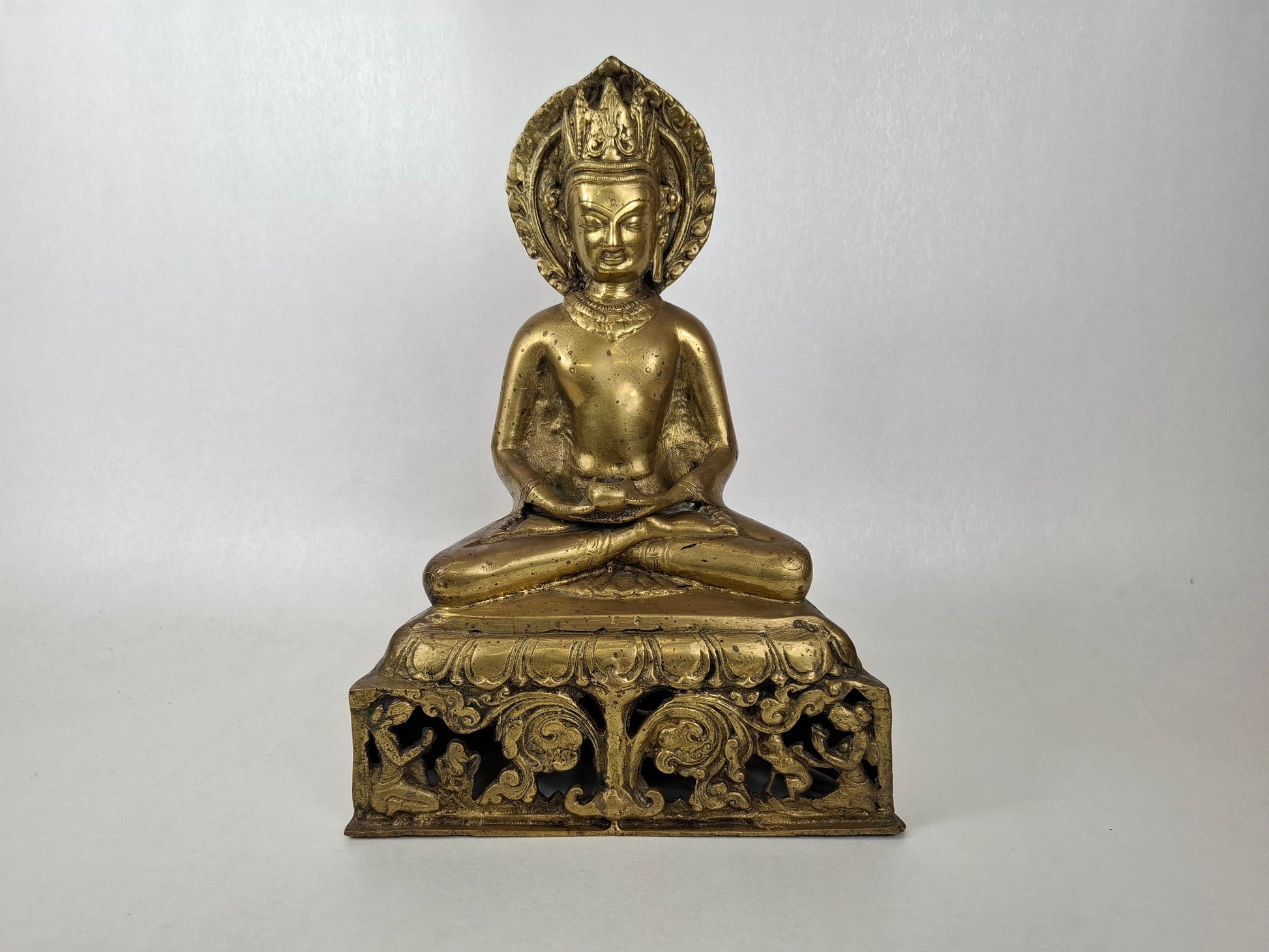 A vintage statue of a buddha in meditation posture. The statue is made in China and dates from the 20th century (1960s-1970s). The buddha statue is made out of brass.