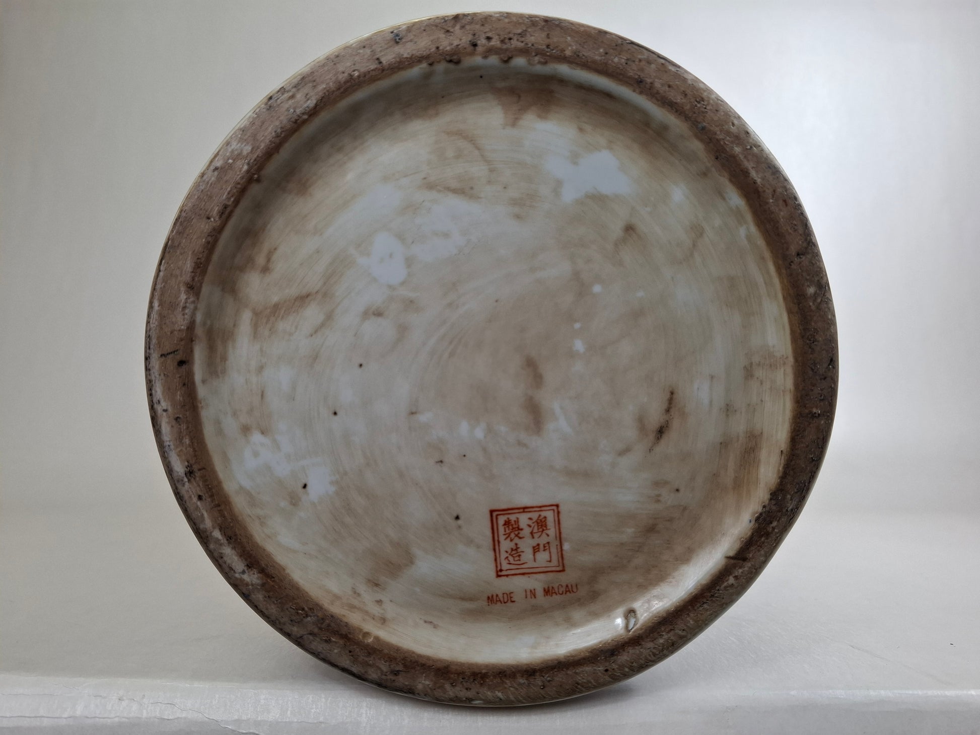 A large porcelain famille rose vase decorated with garden scenes, surrounded with flowers. The vase is made in China and dates from the 20th century (1960s-1980s). At the bottom, the vase is marked with a chinese seal ('Made in Macau, China' seal).