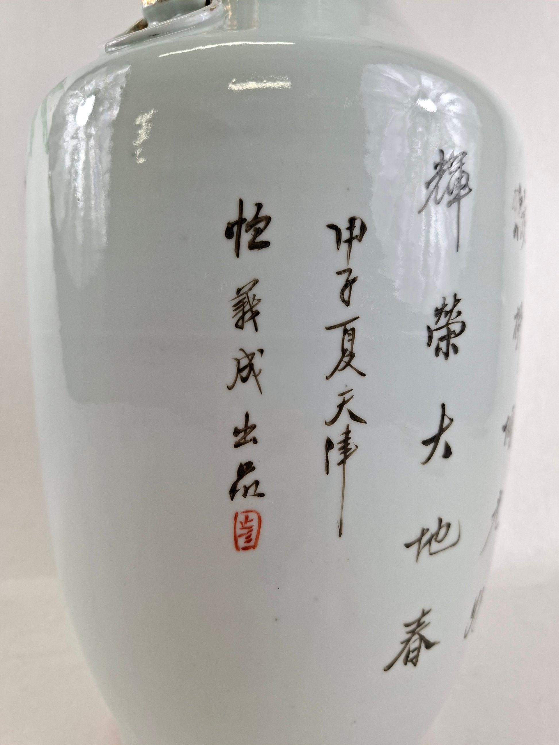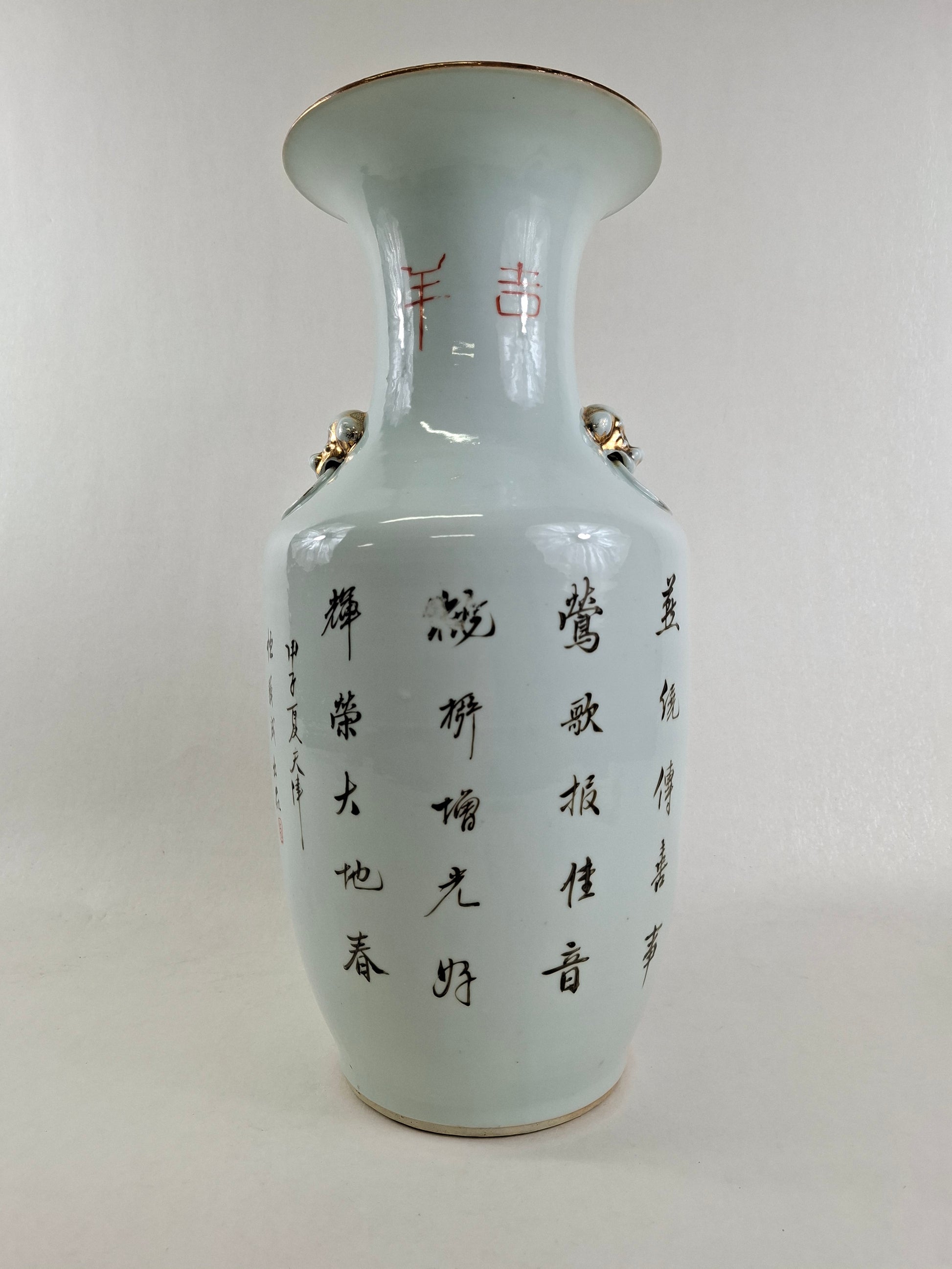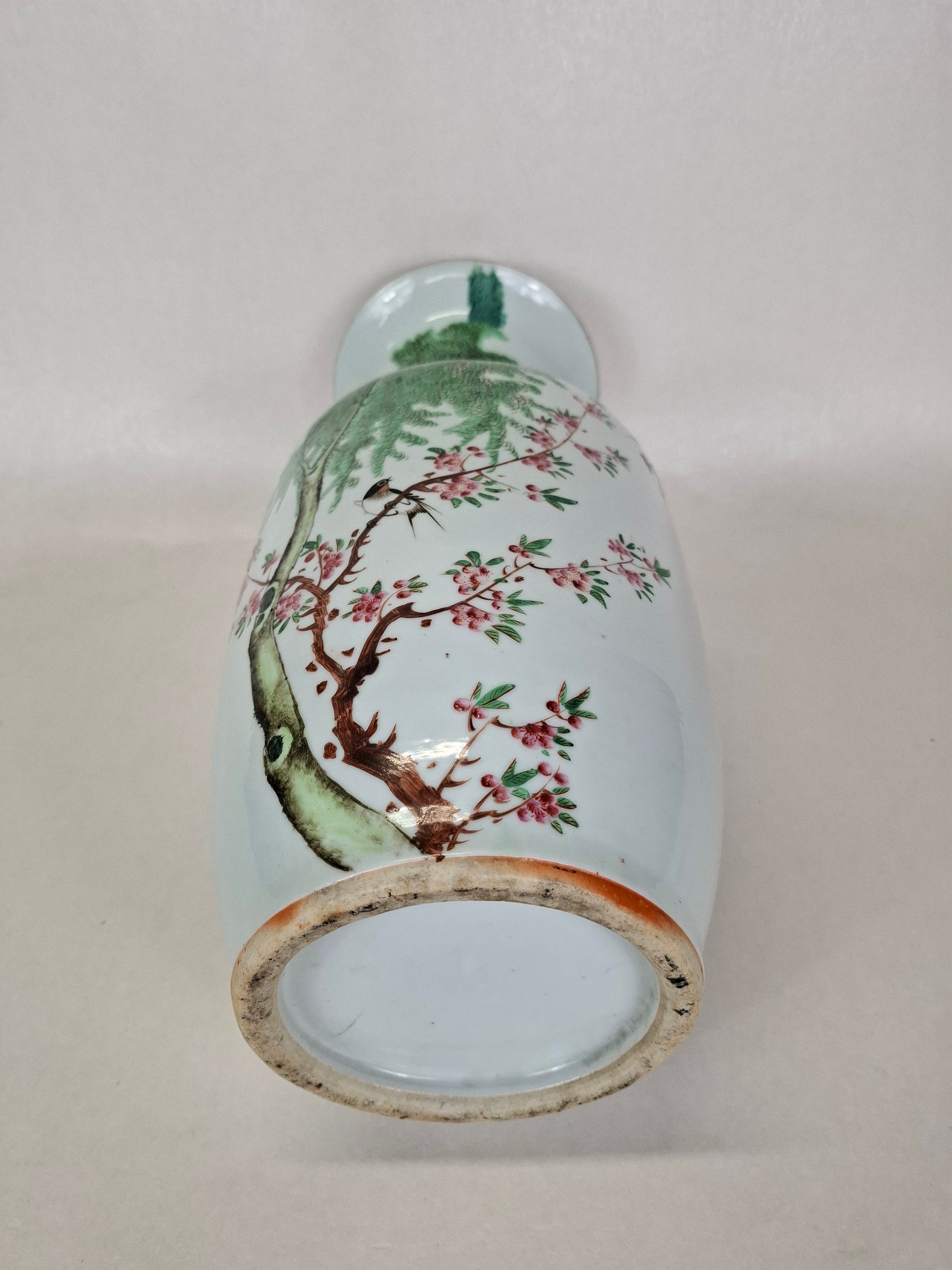 Vase ancien en porcelaine polychrome, orné d'hirondelles et de fleurs printanières sur les arbres. Le revers du vase présente des calligraphies chinoises illustrant un poème. Ce vase, de fabrication chinoise, date de la période républicaine (1912-1949).