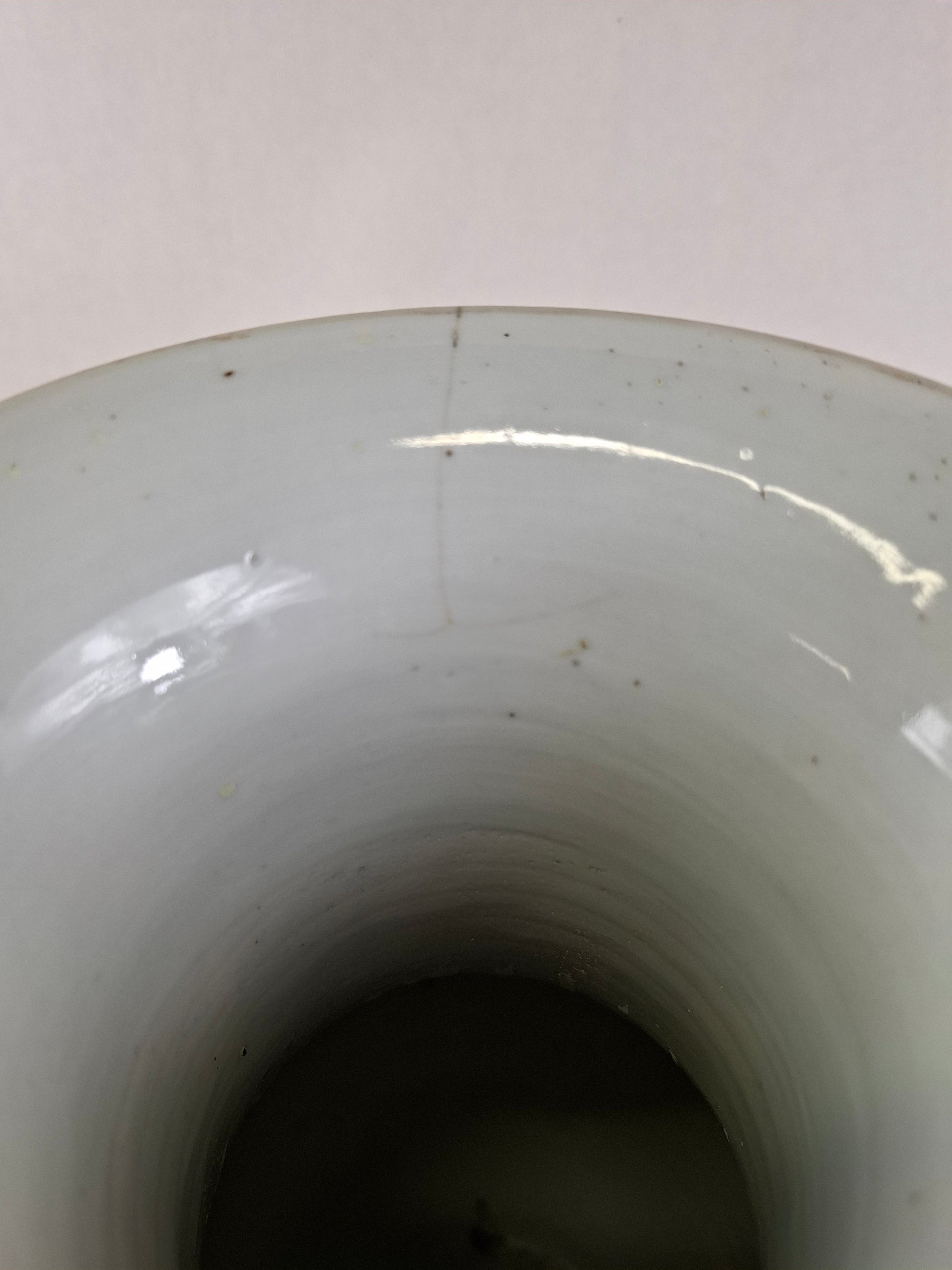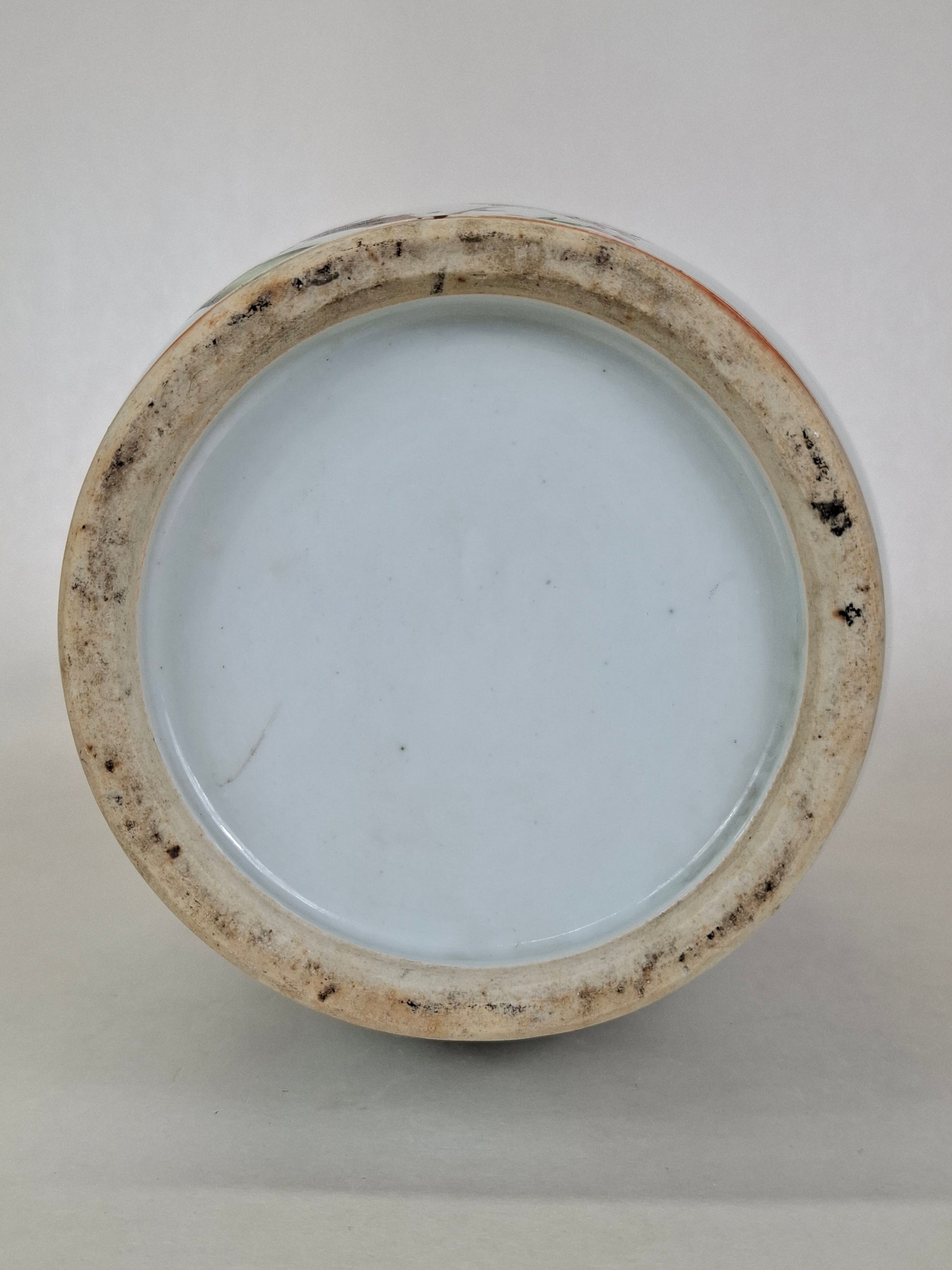 Le vase est en bon état. À l'ouverture, une fine fissure a été repeinte (ancienne restauration) à l'extérieur, la rendant ainsi invisible. Aucun autre dommage ni restauration n'a été constaté (vérifié aux UV).