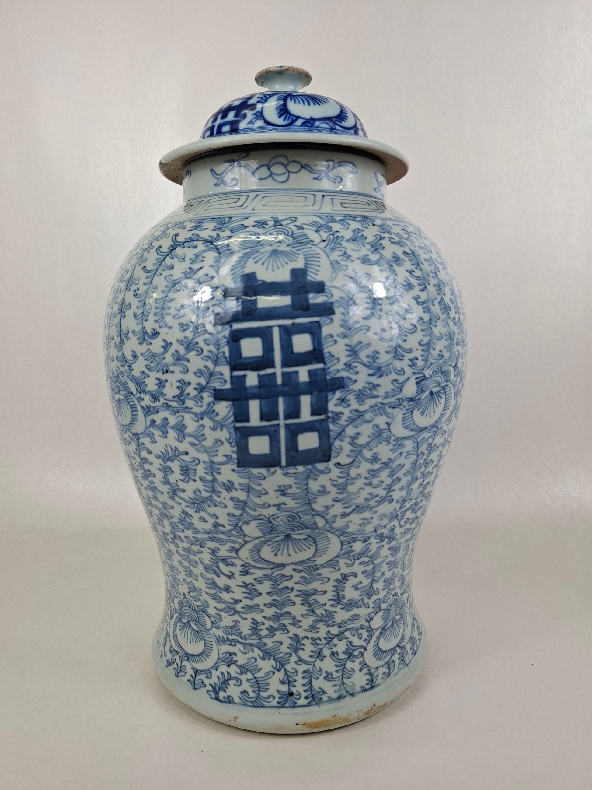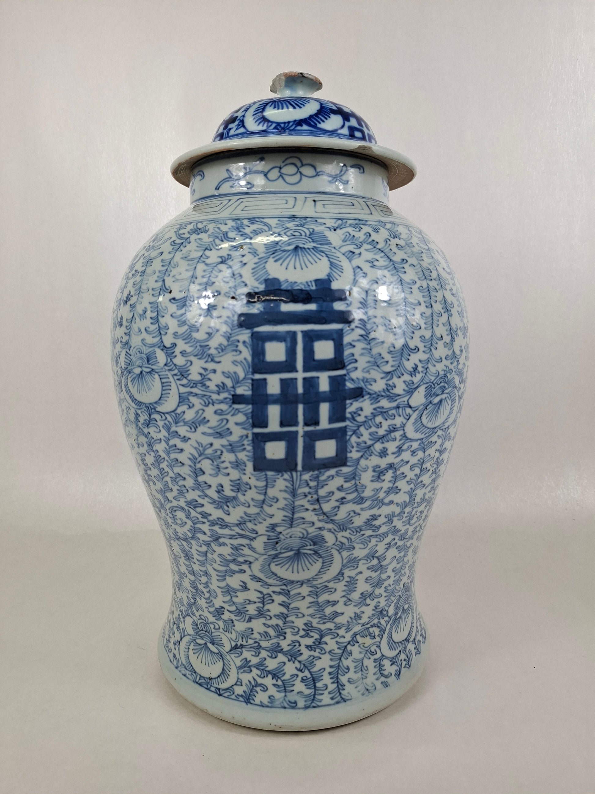 An antique porcelain double happiness temple vase decorated with lucky symbols and floral motifs. The vase is made in China and dates from the end of the 19th century (Qing Dynasty).