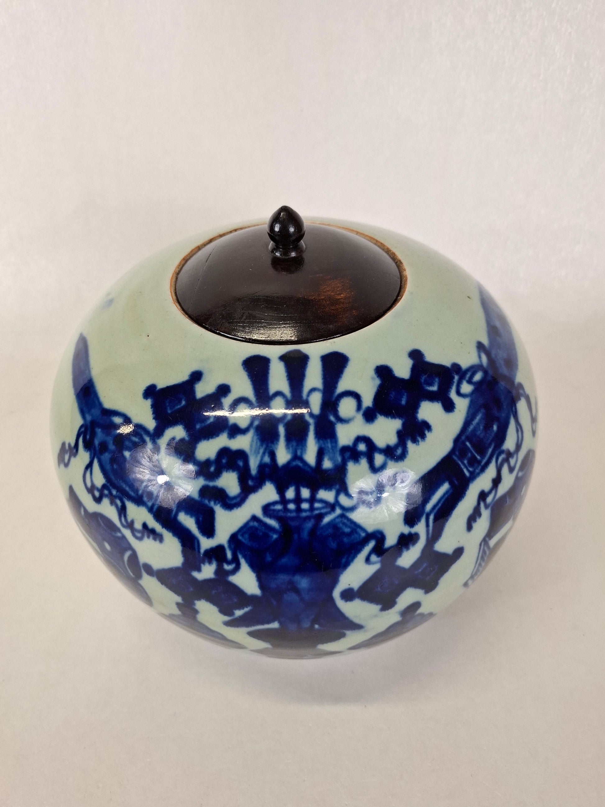 An antique porcelain ginger jar decorated with antiquities in a cobalt blue color. The ginger jar is made in China and dates from the end of the 19th century (Qing Dynasty).