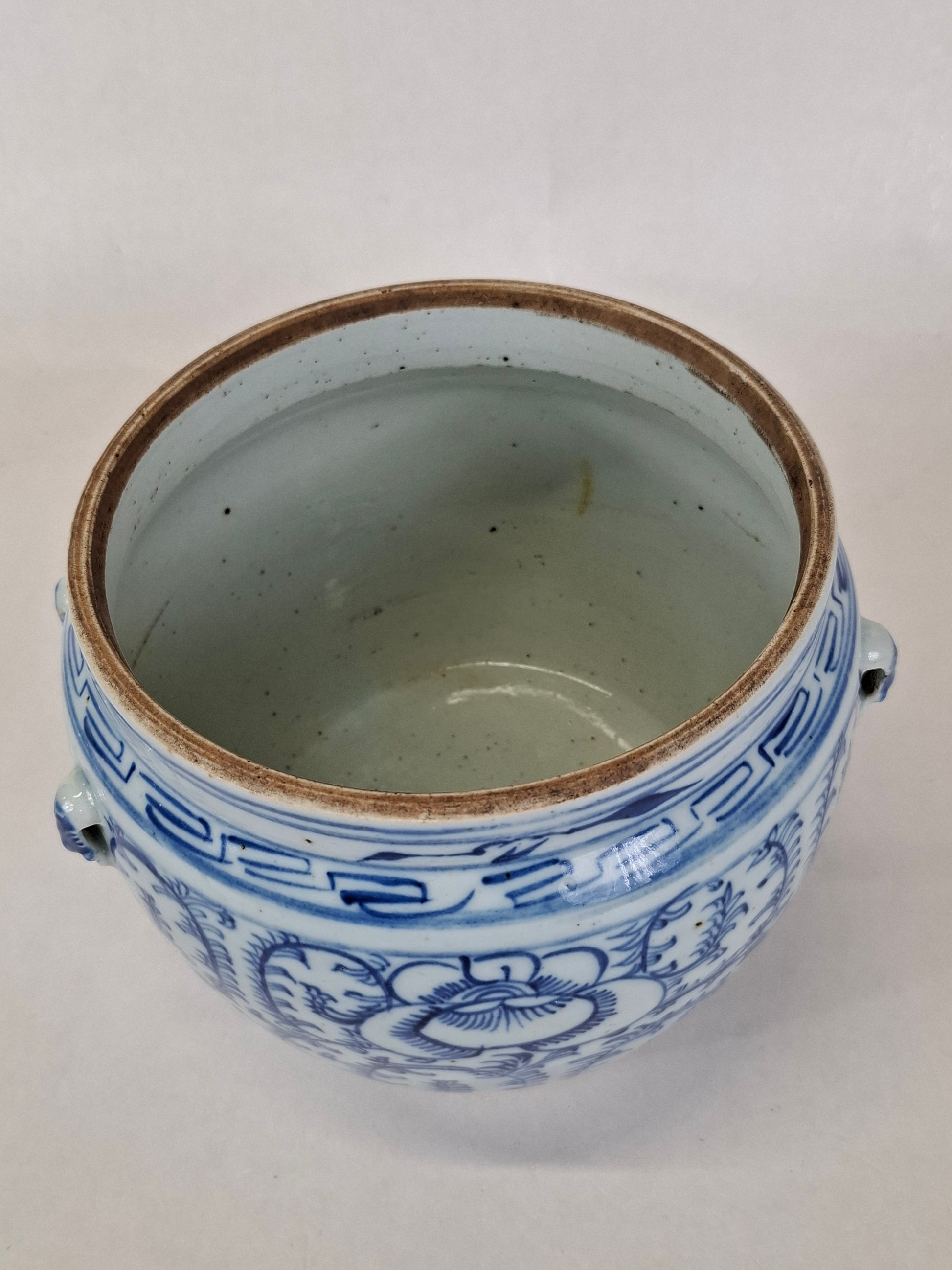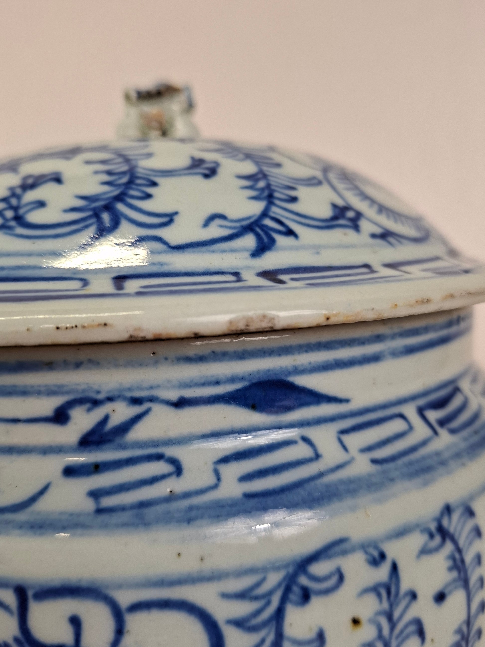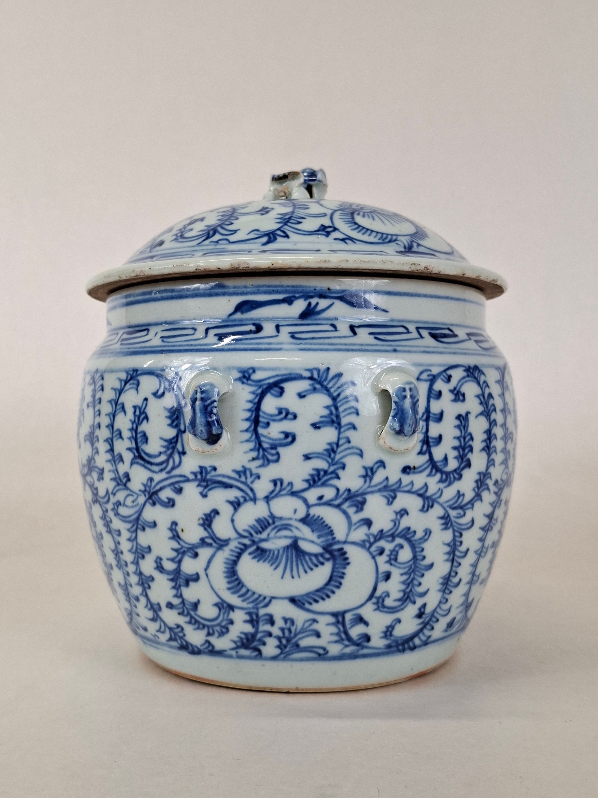 Antique Chinese lidded jar decorated with peonies // Blue and white - Qing Dynasty - End of the 19th/Beginning of the 20th century