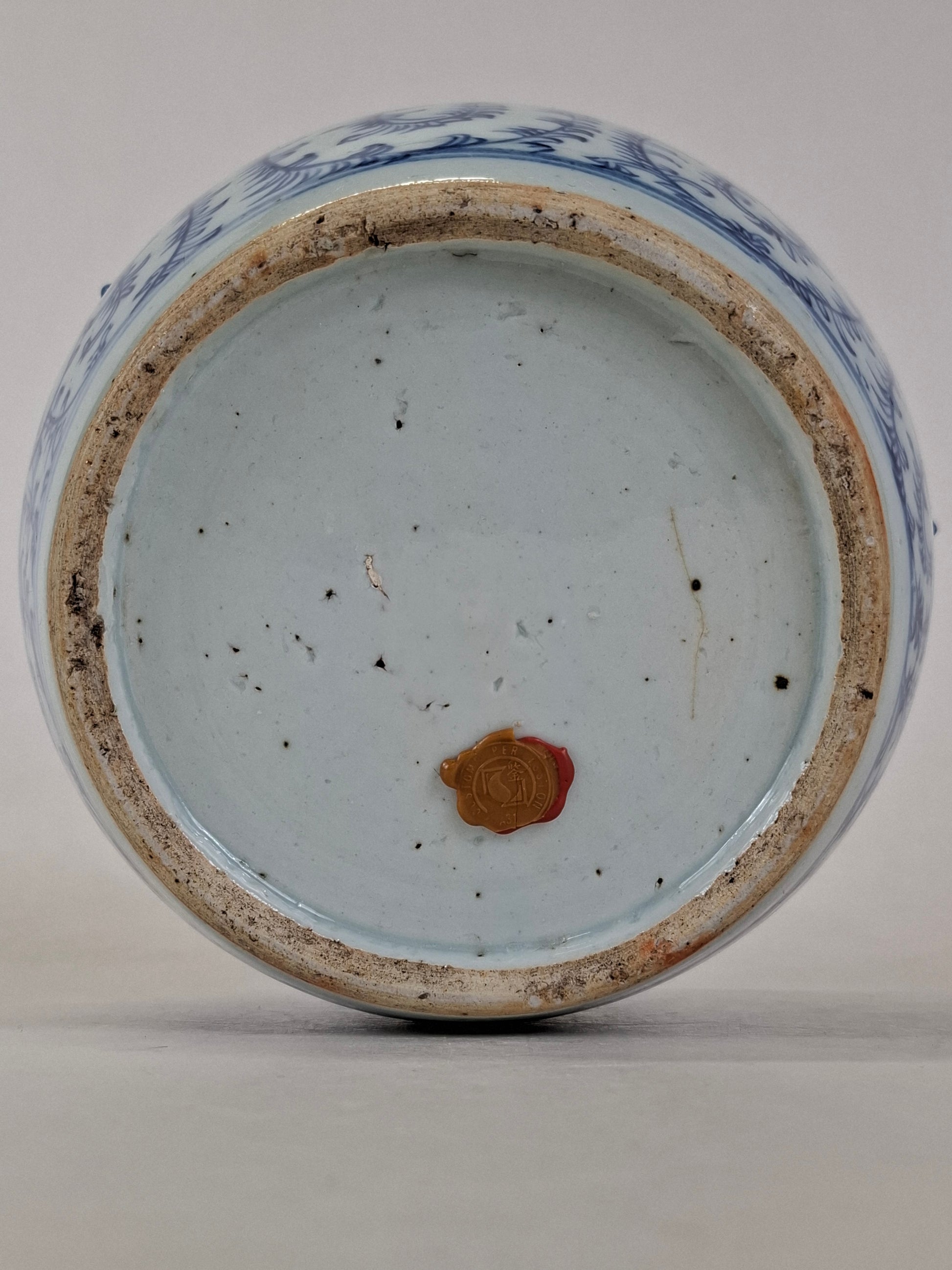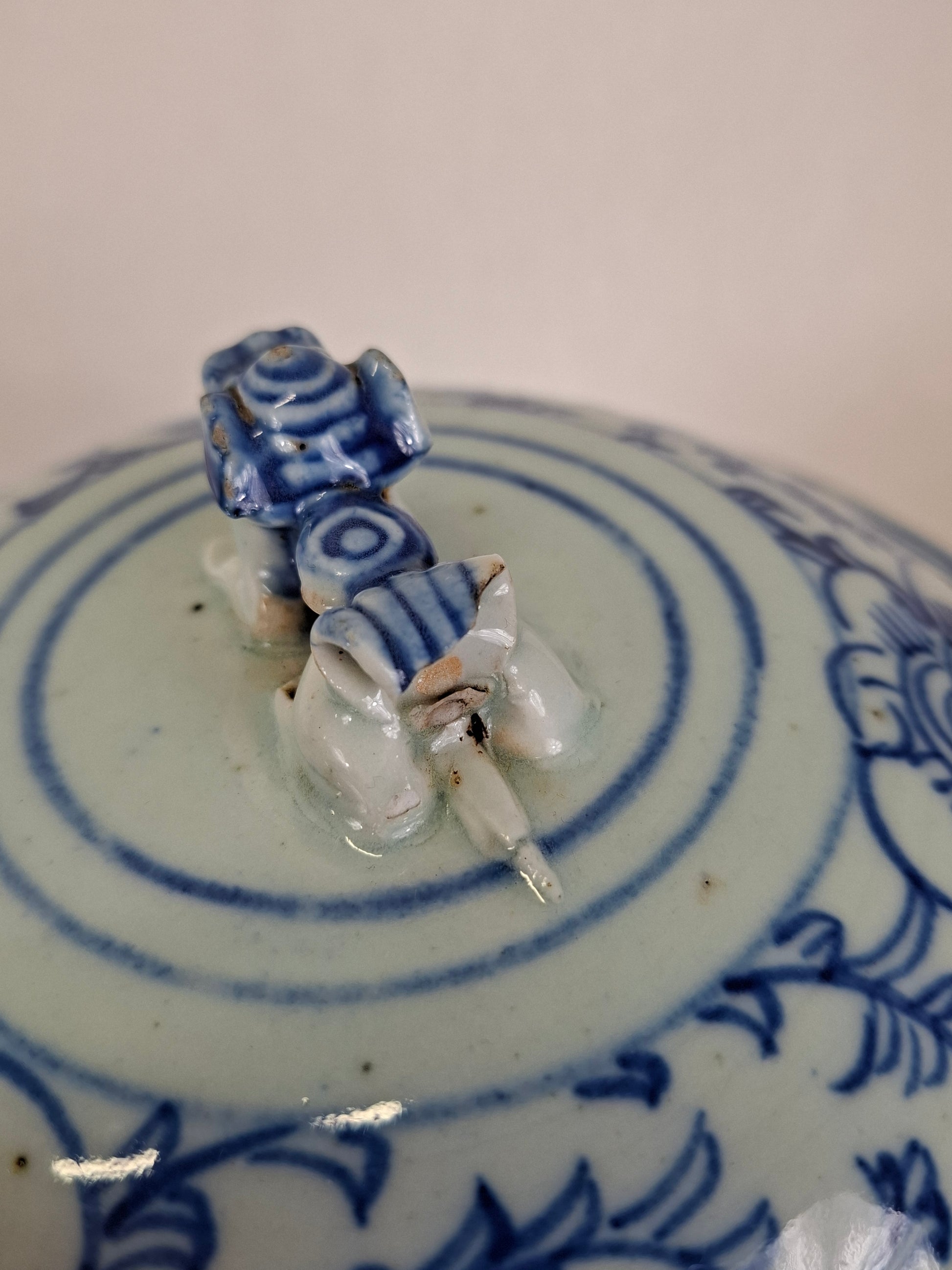The lidded jar is in a good condition. At the lid, there is some minor fritting to to rim. At the tail of the foo dog, there is a chip. At the bottom of the jar, there is a line which was created during the baking process (this line is under the glaze). No other damages or restorations found (UV checked).