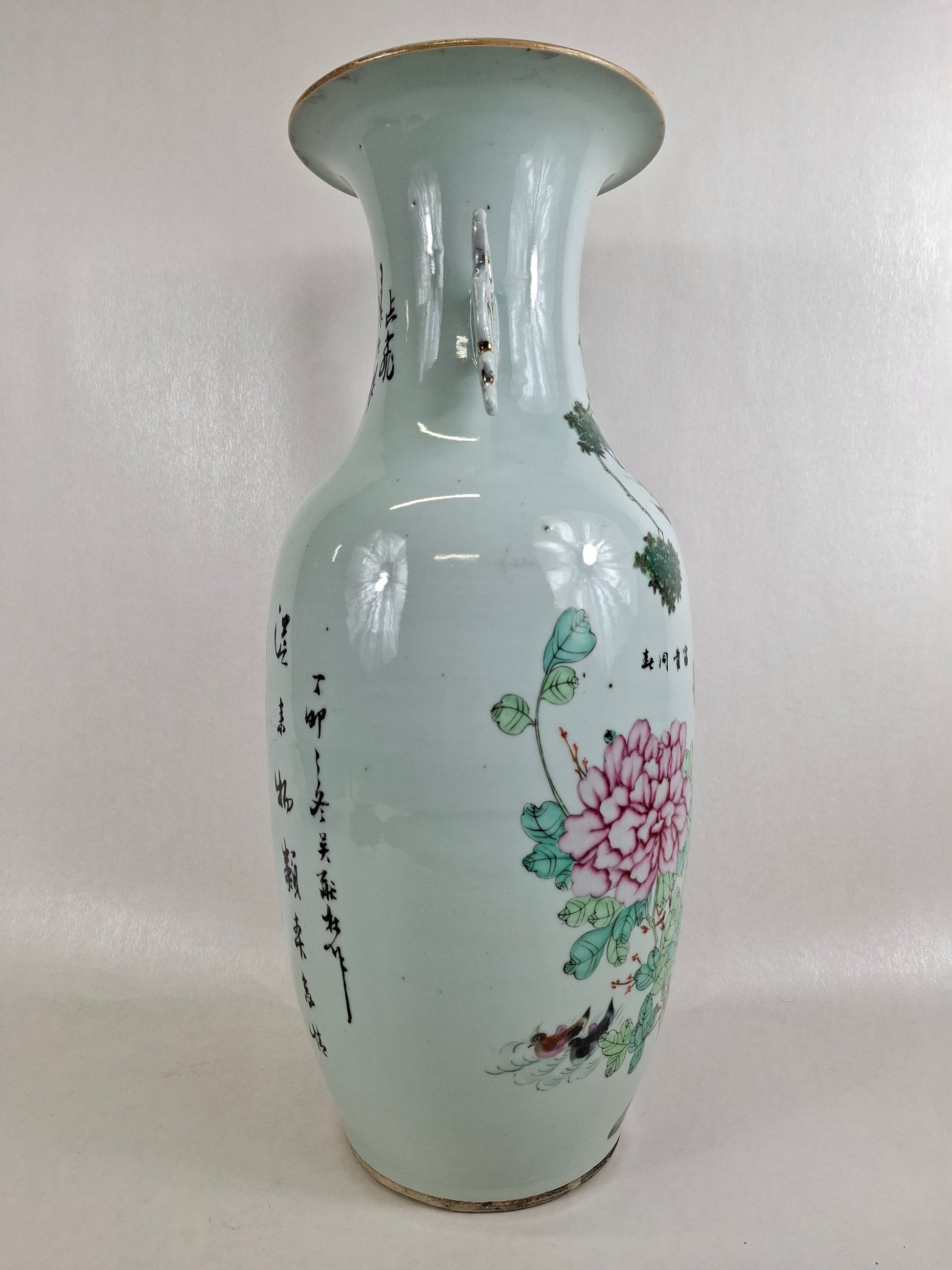 A large antique porcelain polychrome vase decorated with a phoenix and cranes, surrounded with flower patters. At the backside of the vase, you can see Chinese calligraphies which are representing a poem. The vase is made in China and dates from the Republic period (1912-1949).