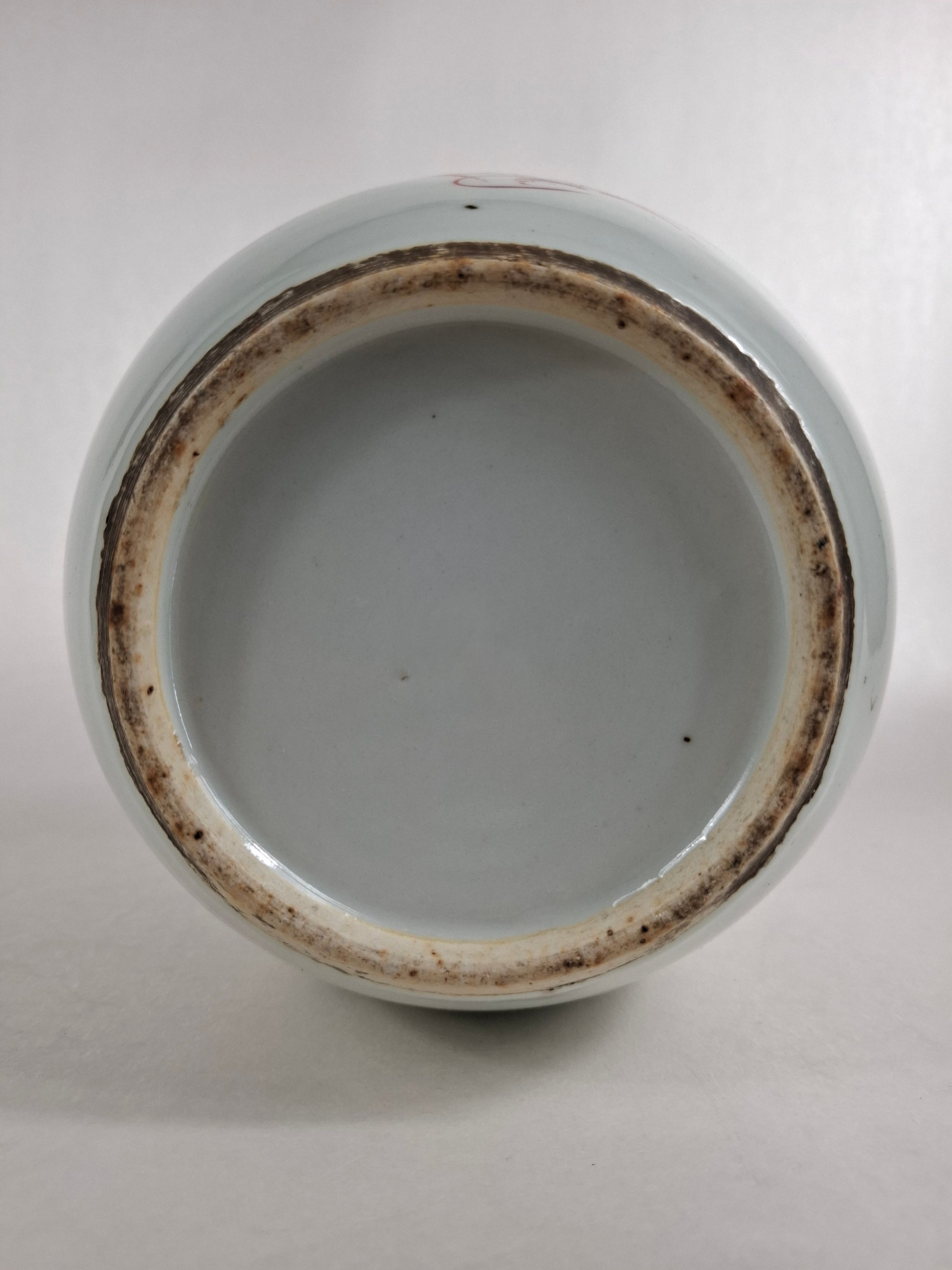 Um pote de gengibre de porcelana antigo decorado com cães foo vermelhos na frente e caligrafias chinesas no verso. O pote de gengibre é feito na China e data do período da República (1912-1949).