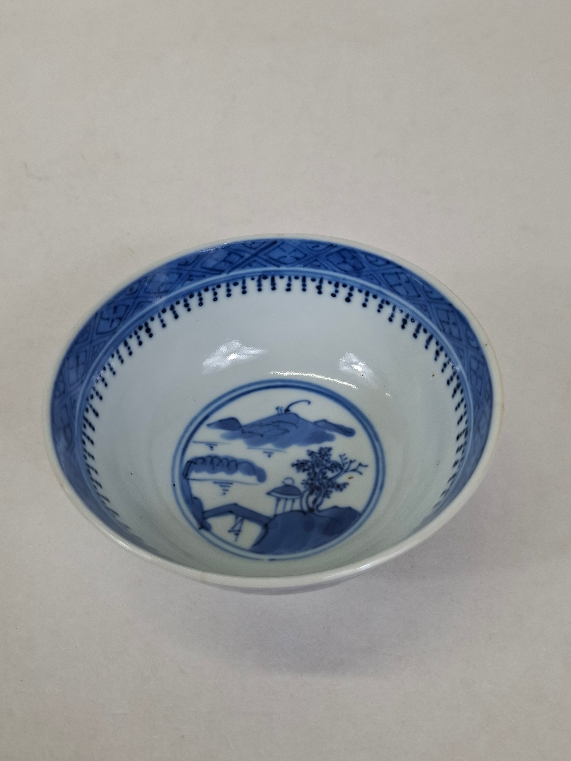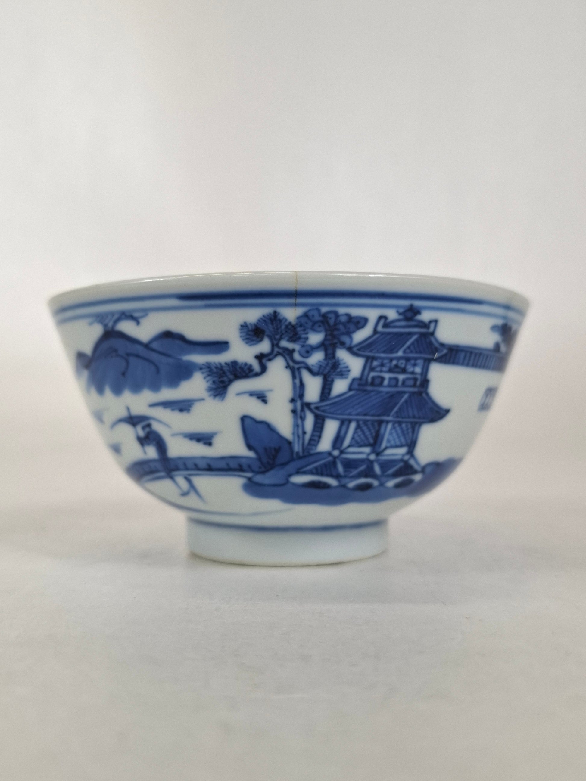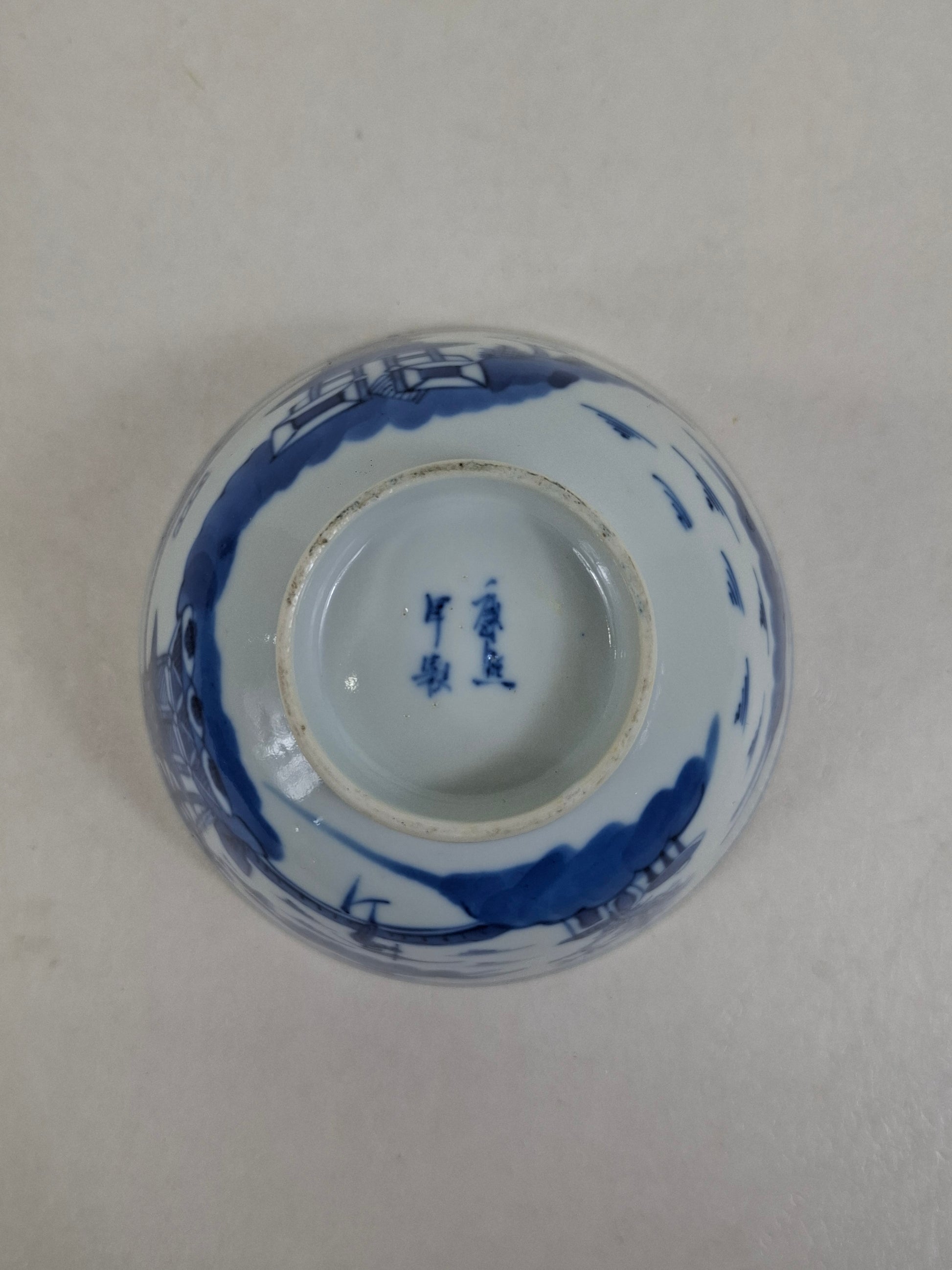 Tigela chinesa antiga Guangxu decorada com uma cena de paisagem // Azul e branco - renascimento Kangxi - século 19