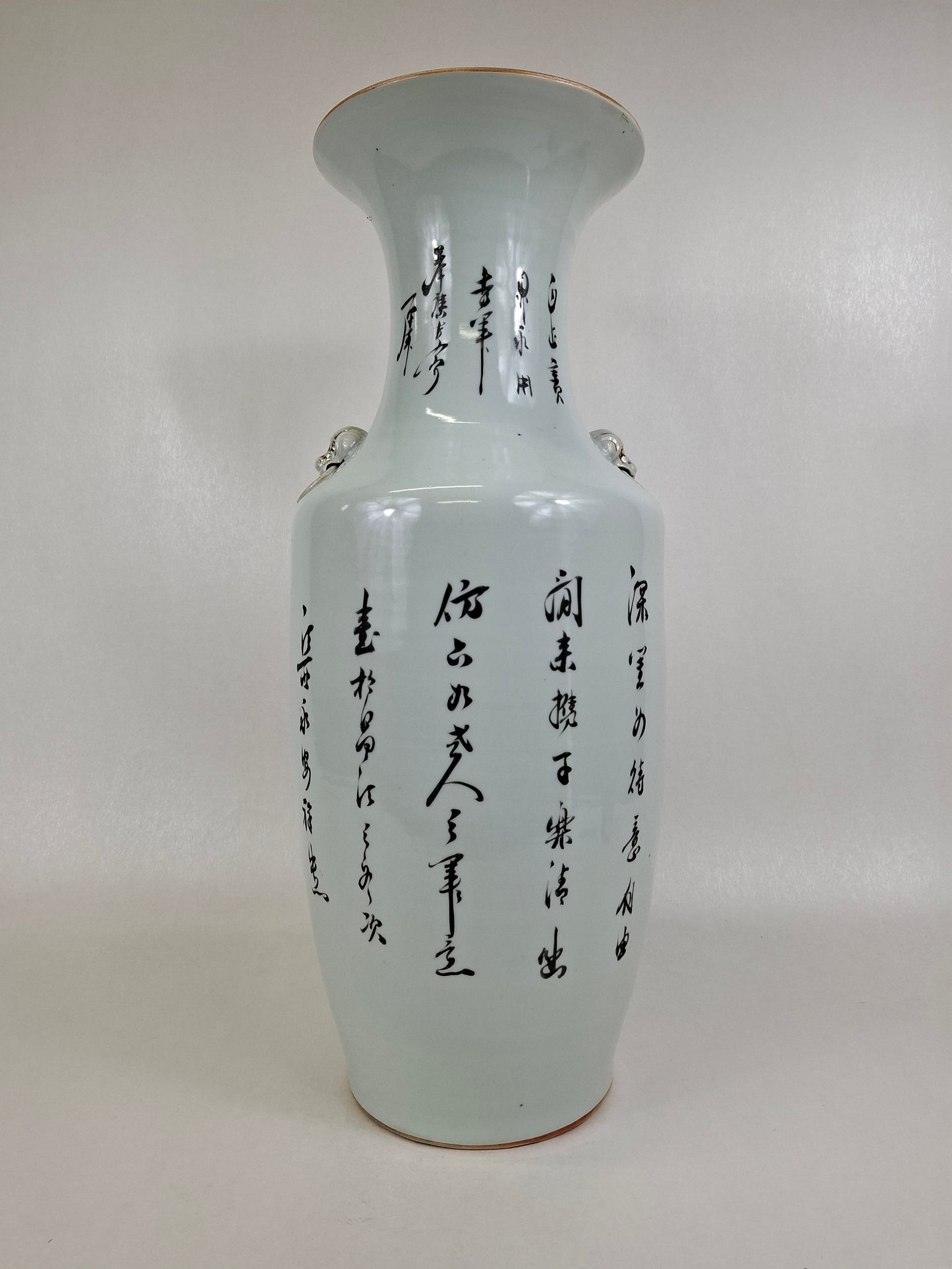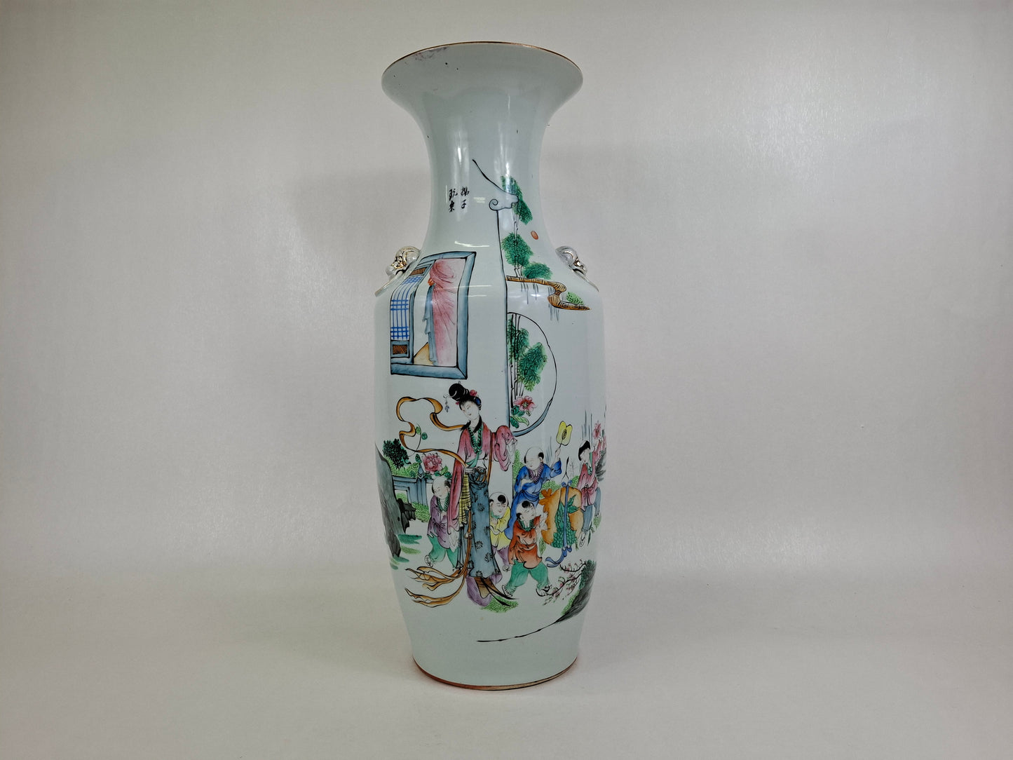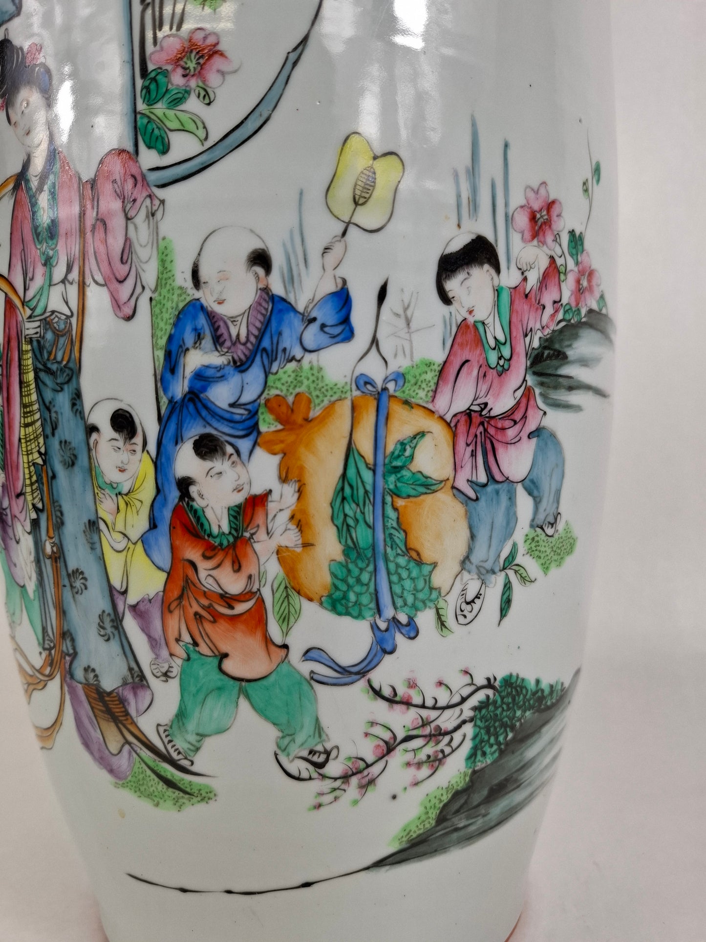 一件大型古董钱江瓷花瓶,饰以花园景致,描绘了嬉戏的孩童。瓶背饰有中国书法,象征着一首诗。该花瓶产于中国,可追溯至民国时期(1912-1949)。