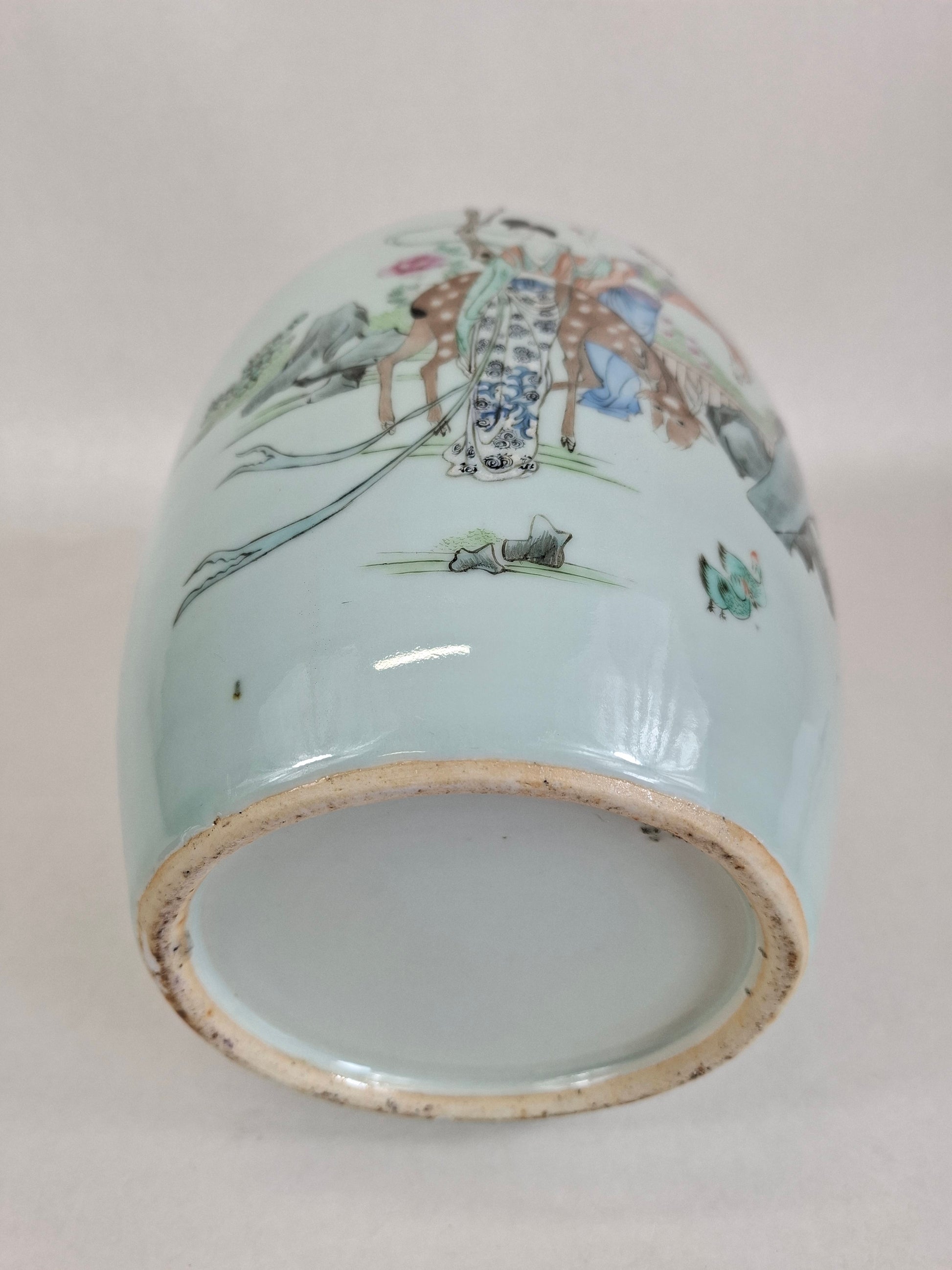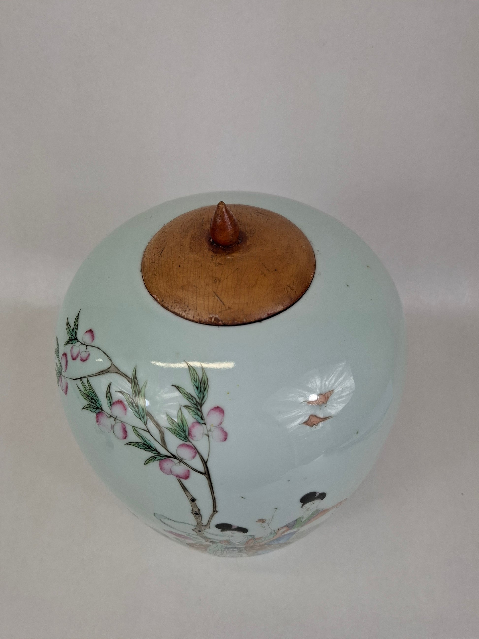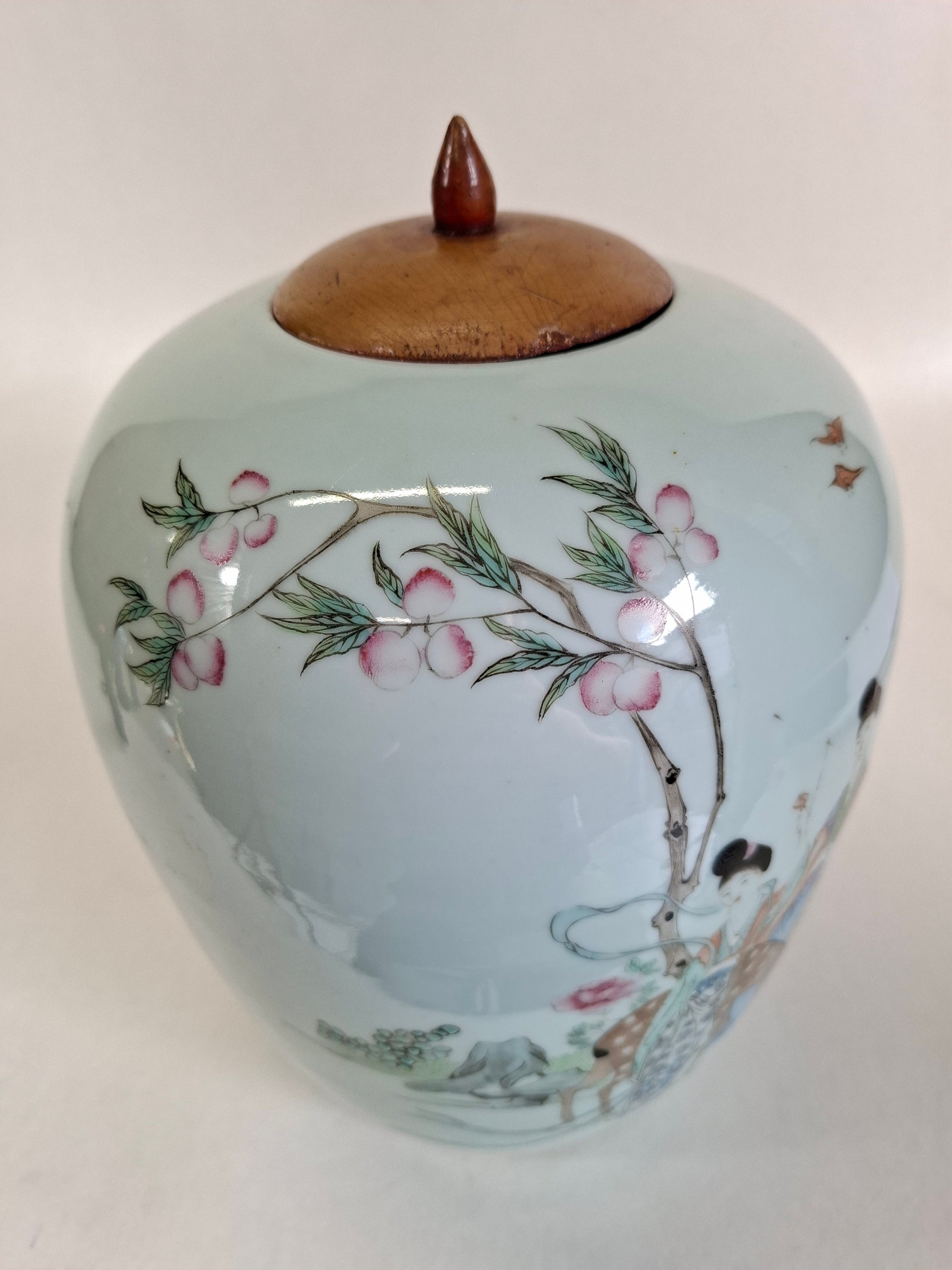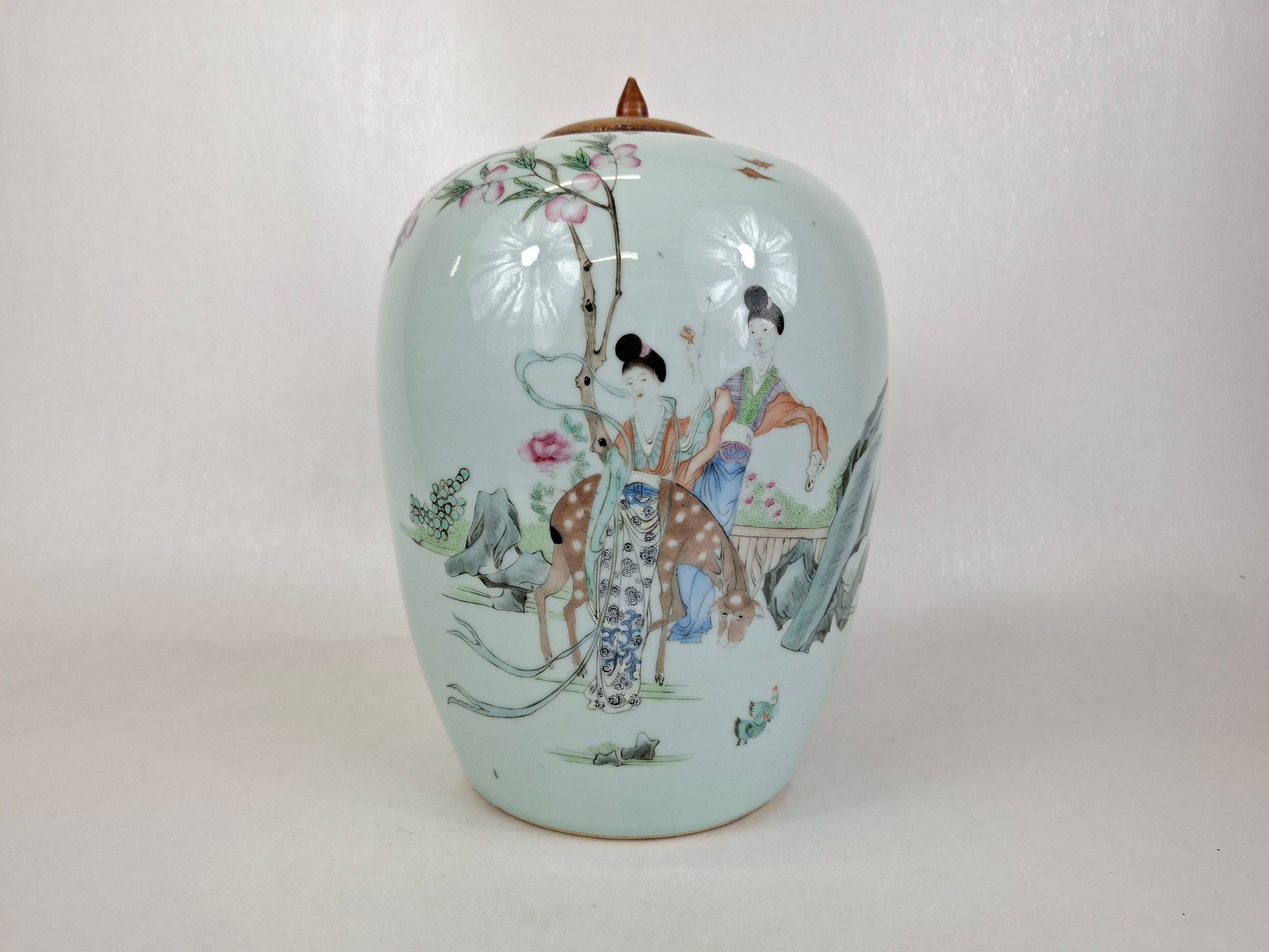 这是一件古董瓷姜罐,正面绘有桃树下女子与鹿的图案。背面则饰以中国书法,组成一首诗句。此姜罐产于中国,年代为民国时期(1912-1949年)。罐身绘色柔和,品质上乘。