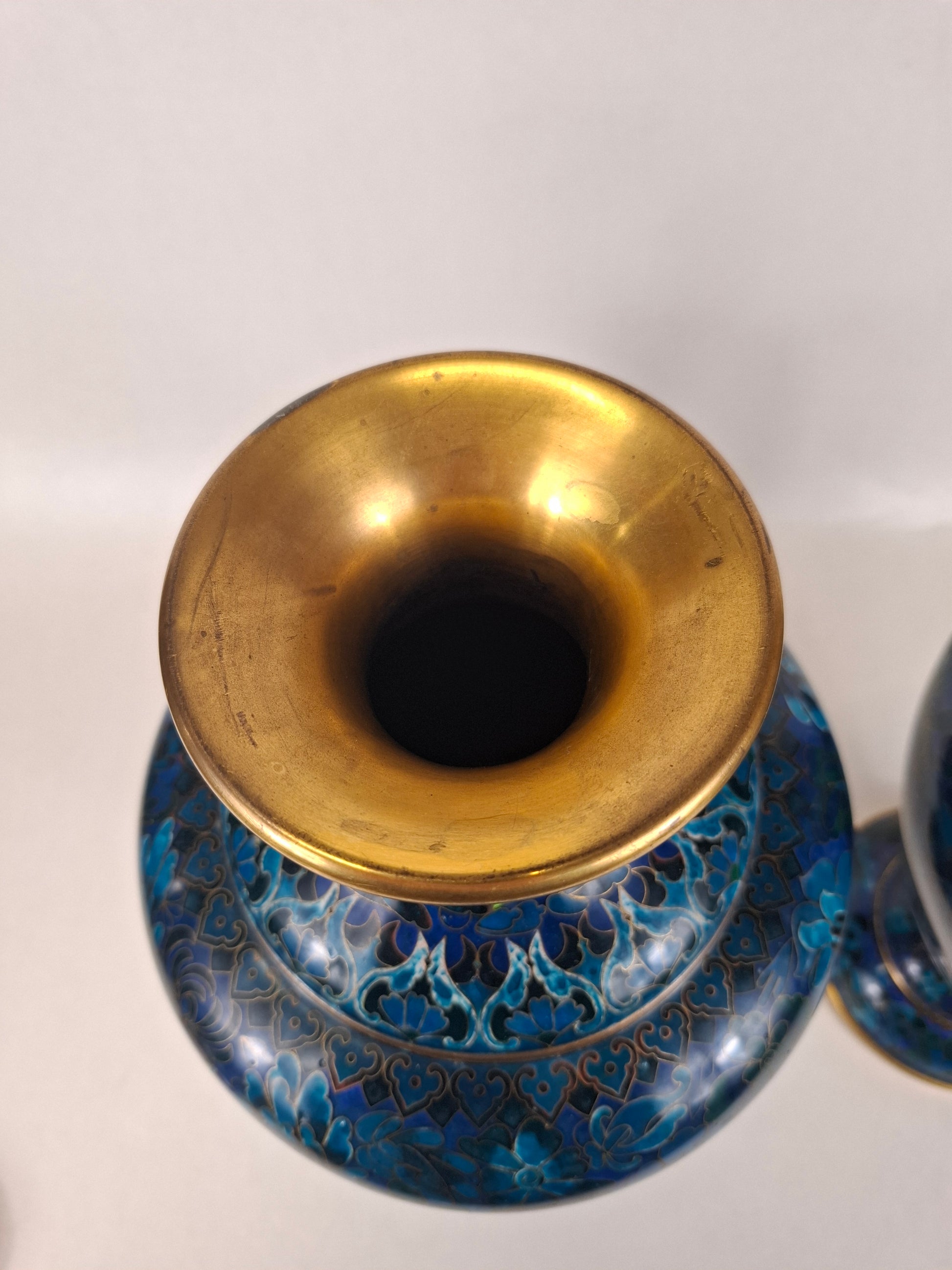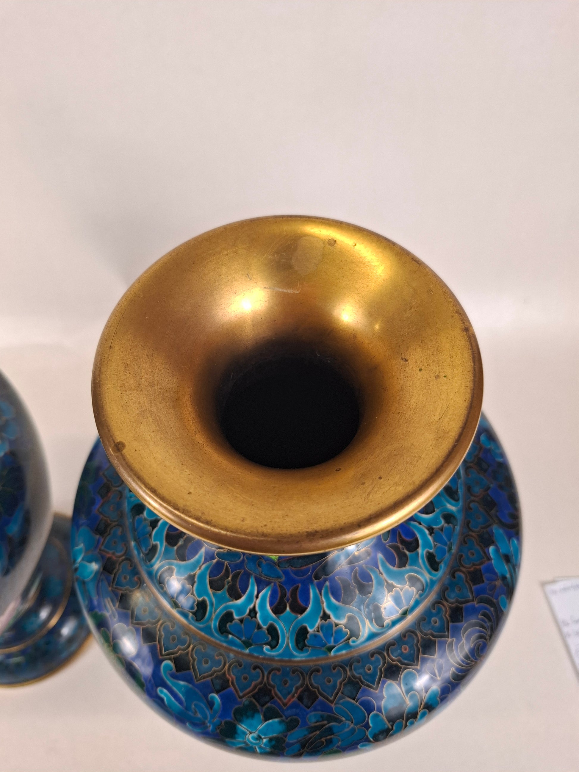 一对大型掐丝珐琅花瓶,瓶身饰以蓝色底花篮图案。花瓶产于中国,年代为20世纪(1970年代至1980年代)。