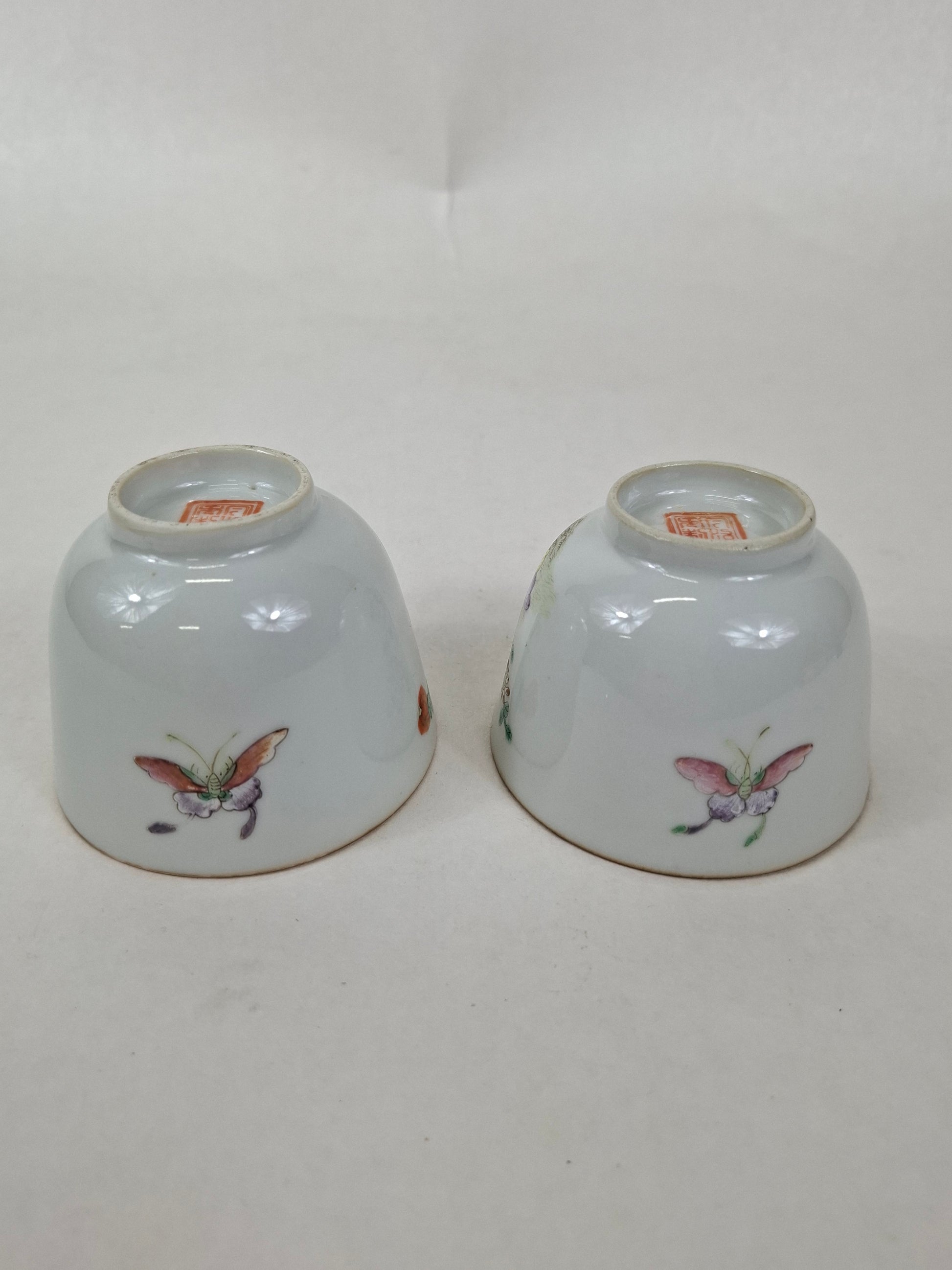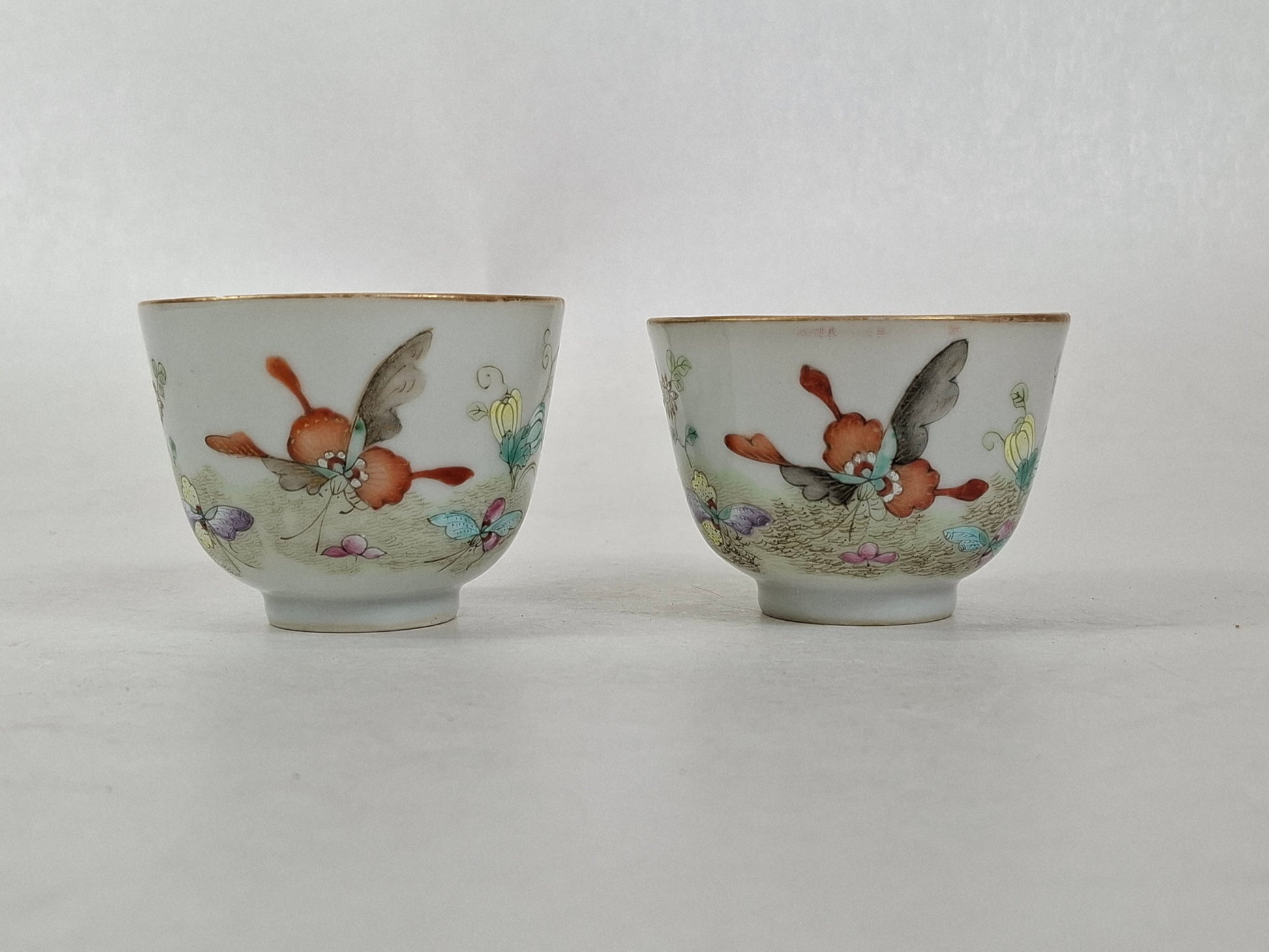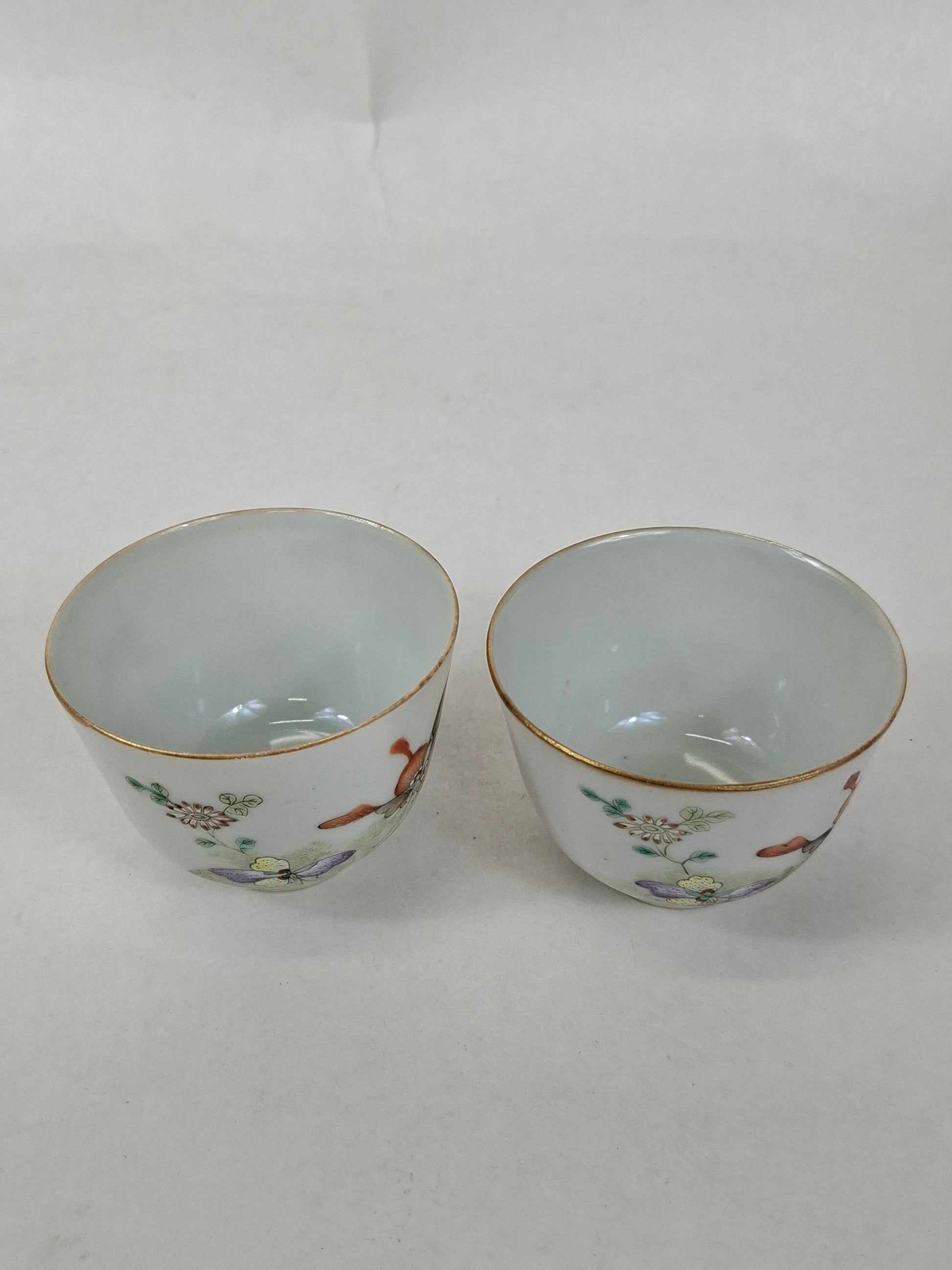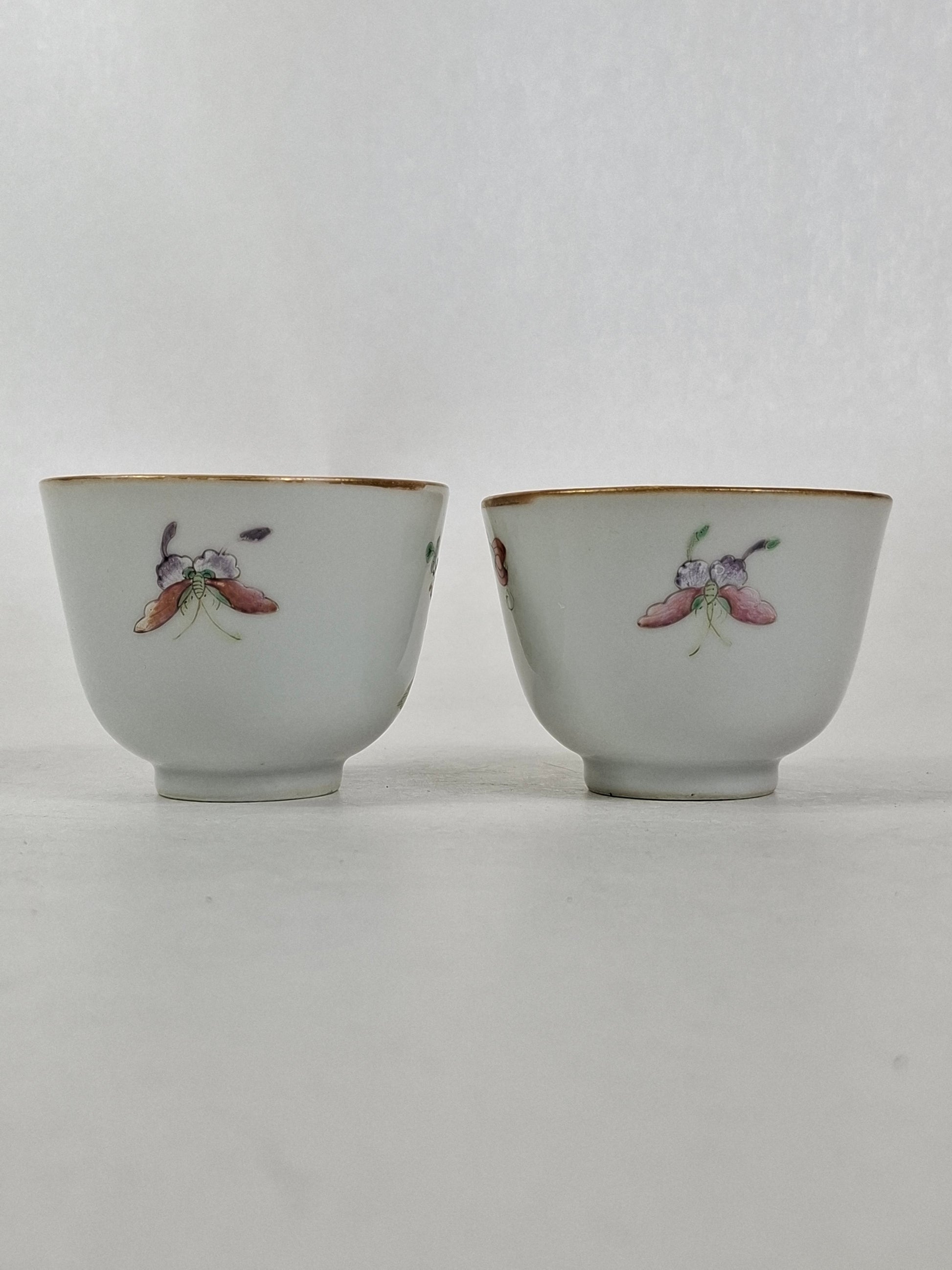 一套两只中国古董粉彩茶杯,饰以蝴蝶和花卉图案 // 同治款 - 20世纪早期