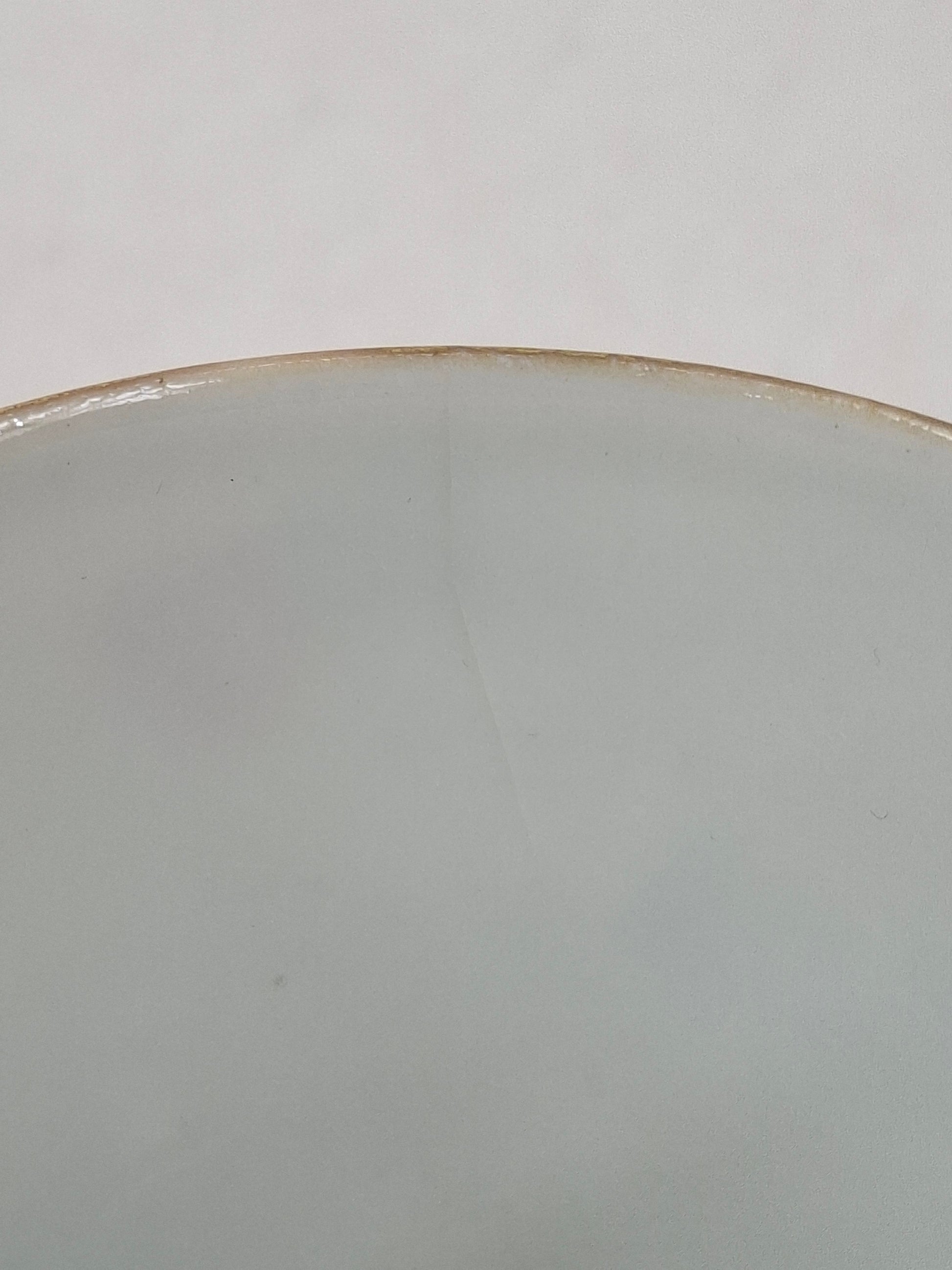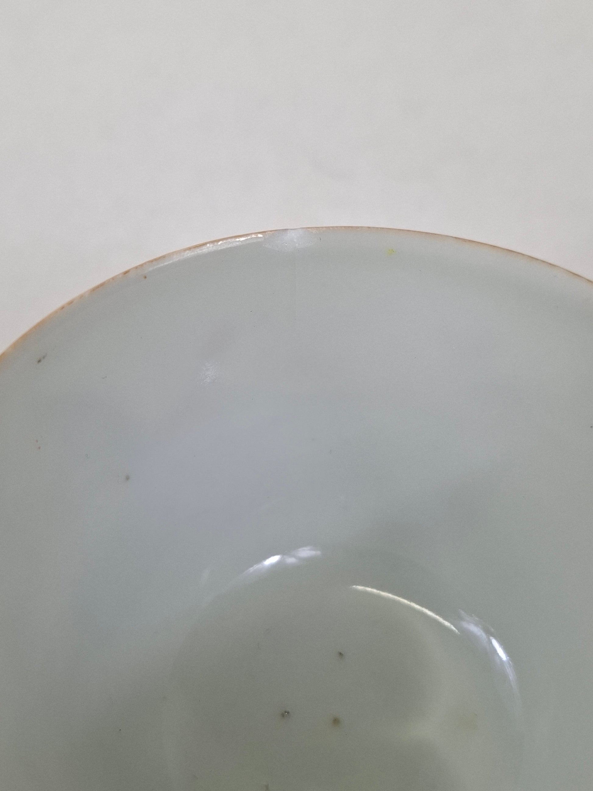 其中一只茶杯品相完美,没有任何损坏或修复痕迹。另一只茶杯杯口边缘有一处磕碰,并有一条约1厘米长的细裂纹。这只茶杯杯口边缘还有第二条细裂纹(详见图片)。除此以外,未发现其他损坏或修复痕迹(已进行紫外线检测)。